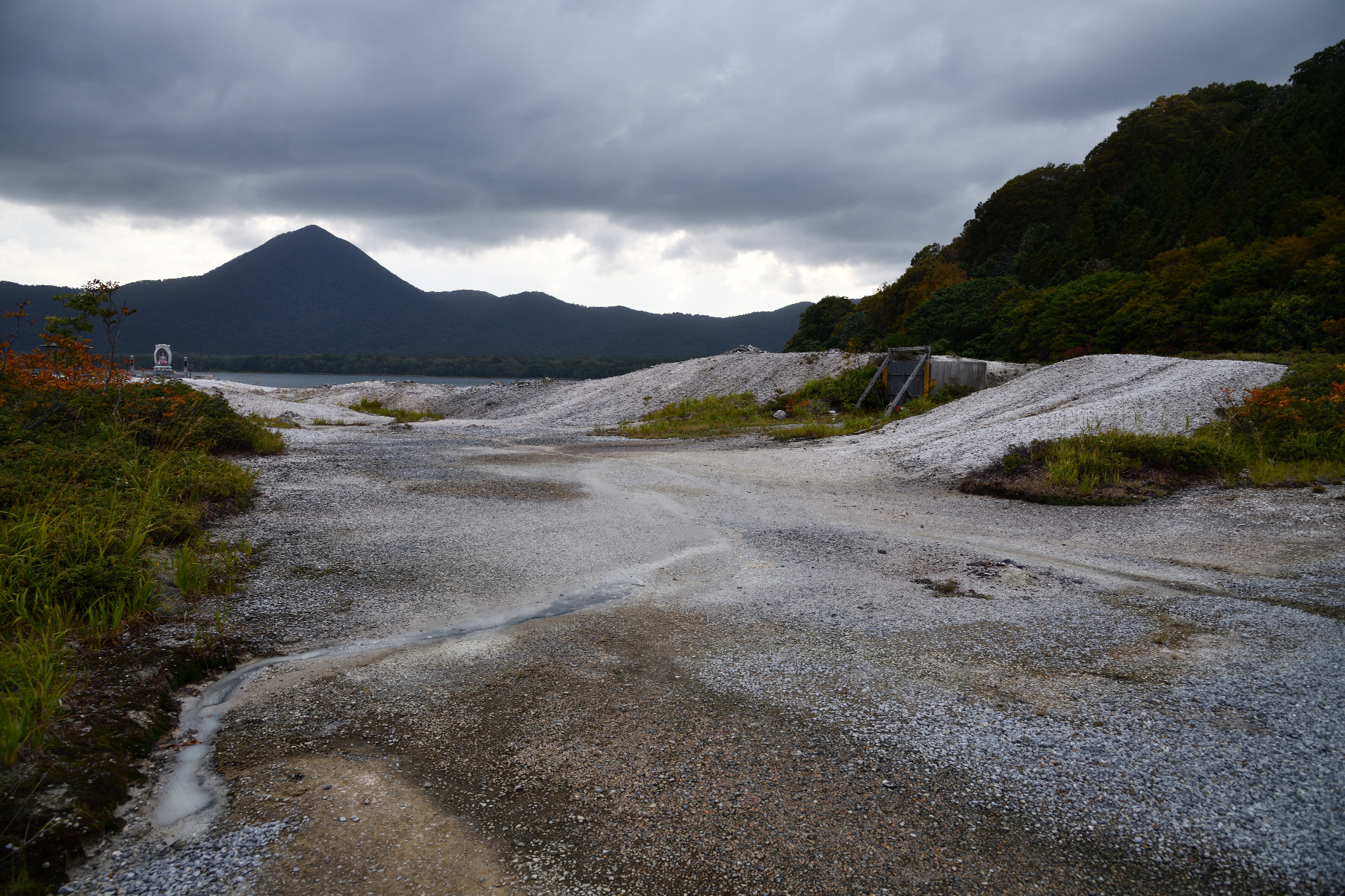 恐山から東側に下る山道は、幅はあるのですが端に溝があり落ち葉で隠れていたりします。うっかり寄せたら脱輪するので実は片側が崖の場合と同様に危険です。
