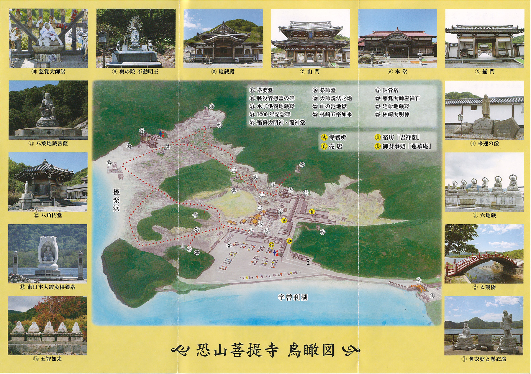 パンフレットにあった恐山の鳥瞰図です。地蔵殿左手から中に入り色々な所を巡っていきます。