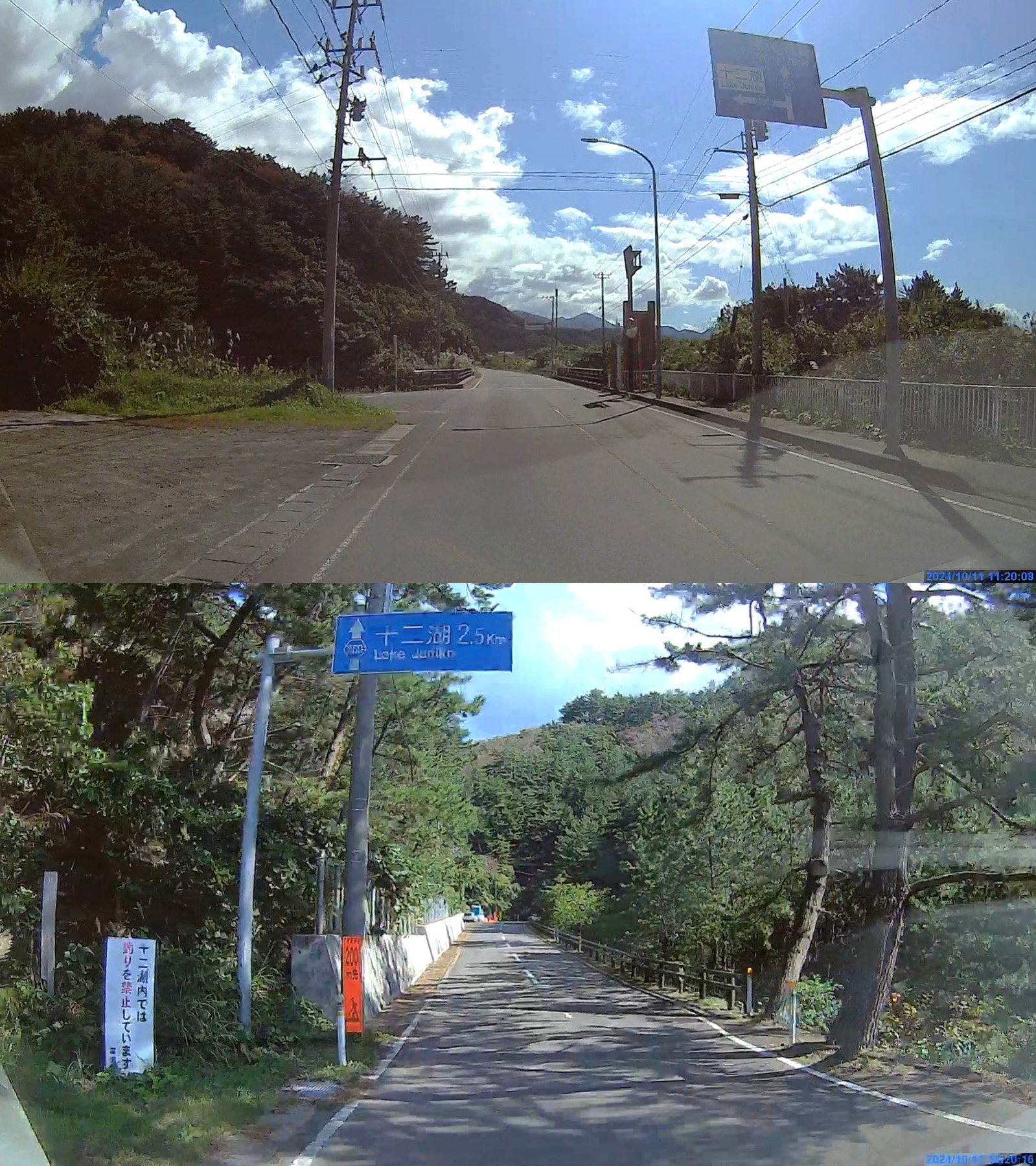 ![]() 引き続き十二湖に向かって走っていたらナビが左に入れと言うので入ったのですが・・・。とんでもなく狭い道でした。 十二湖へ向かう山道かと思ったら違いました。道を間違えたのかなと後でドラレコ映像を確認しましたが、「斜め左方向です」としっかりアナウンスしてました^^。 |