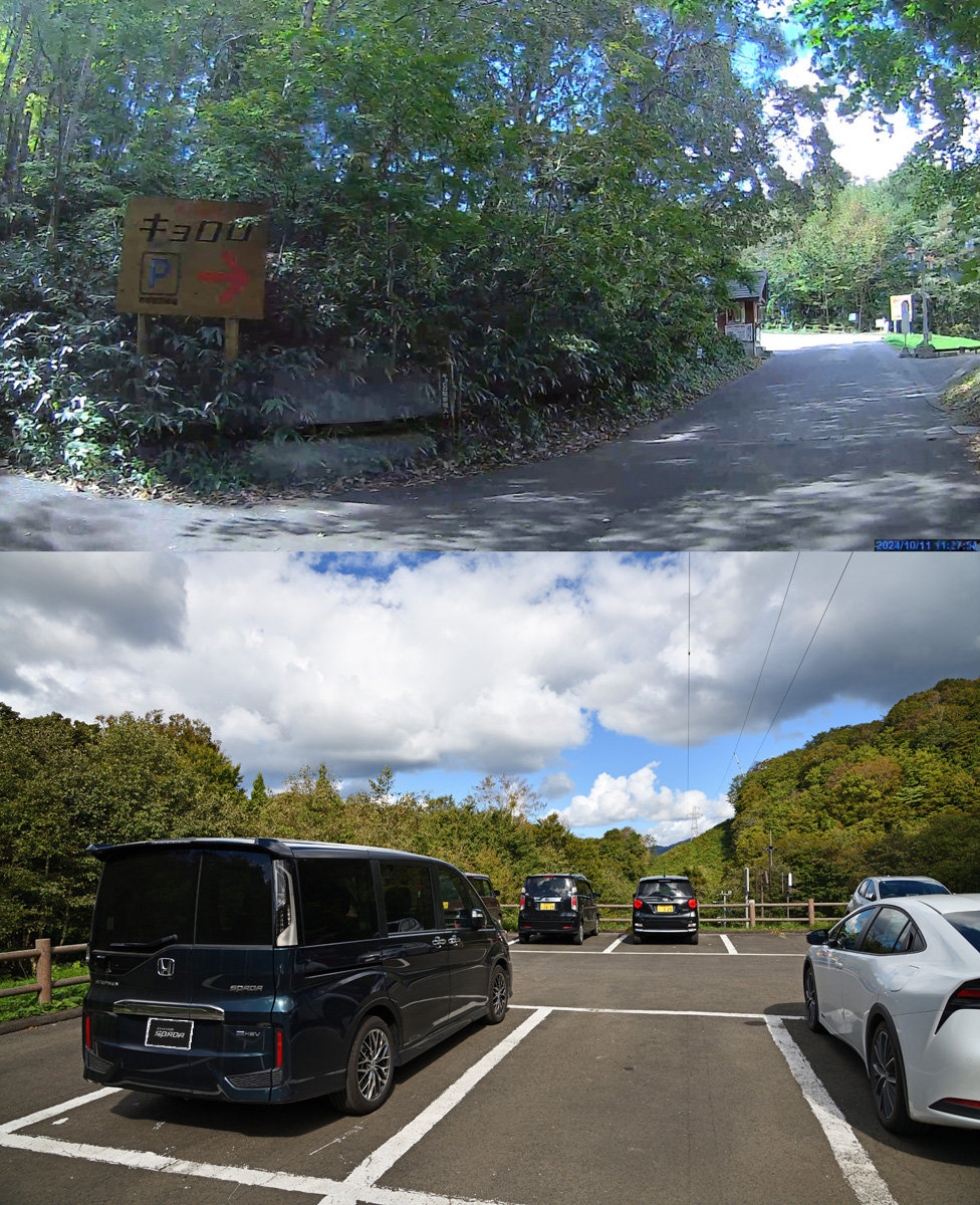 ![]() 11:30に森の物産館キョロロの駐車場に到着。駐車場は一段高いところにあり階段を降りたところで駐車料金500円を徴収されます。 |