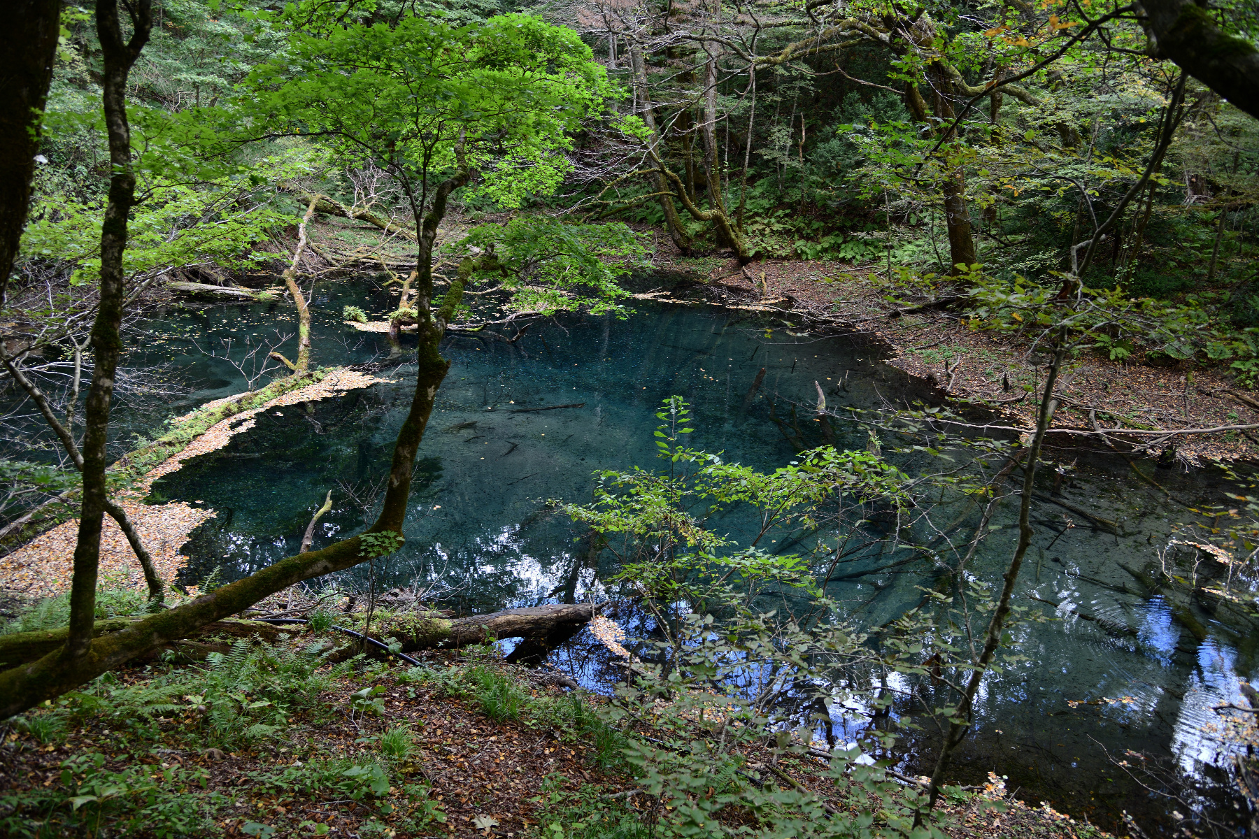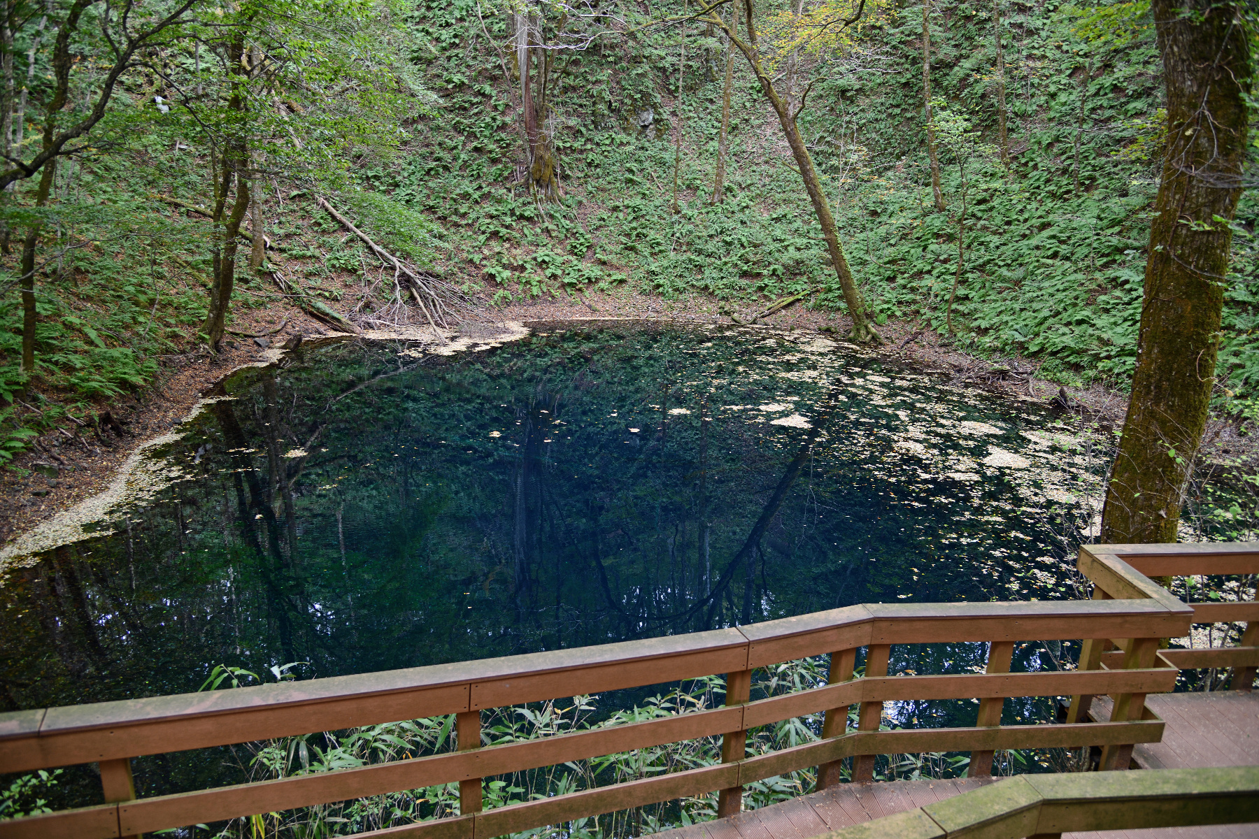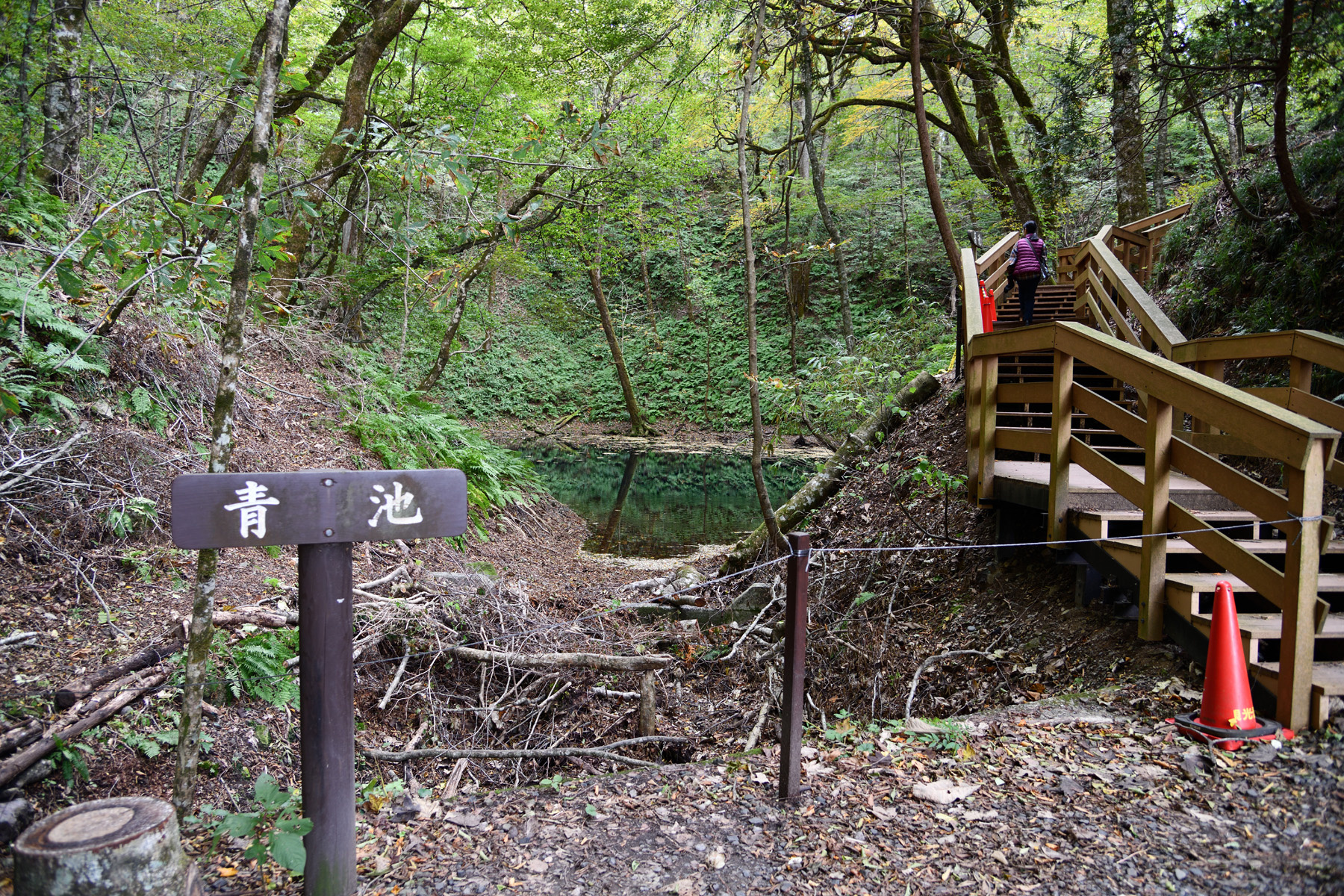 ![]() ウッドデッキから見た青池。確かに神秘的な青です。 [高解像度写真] |