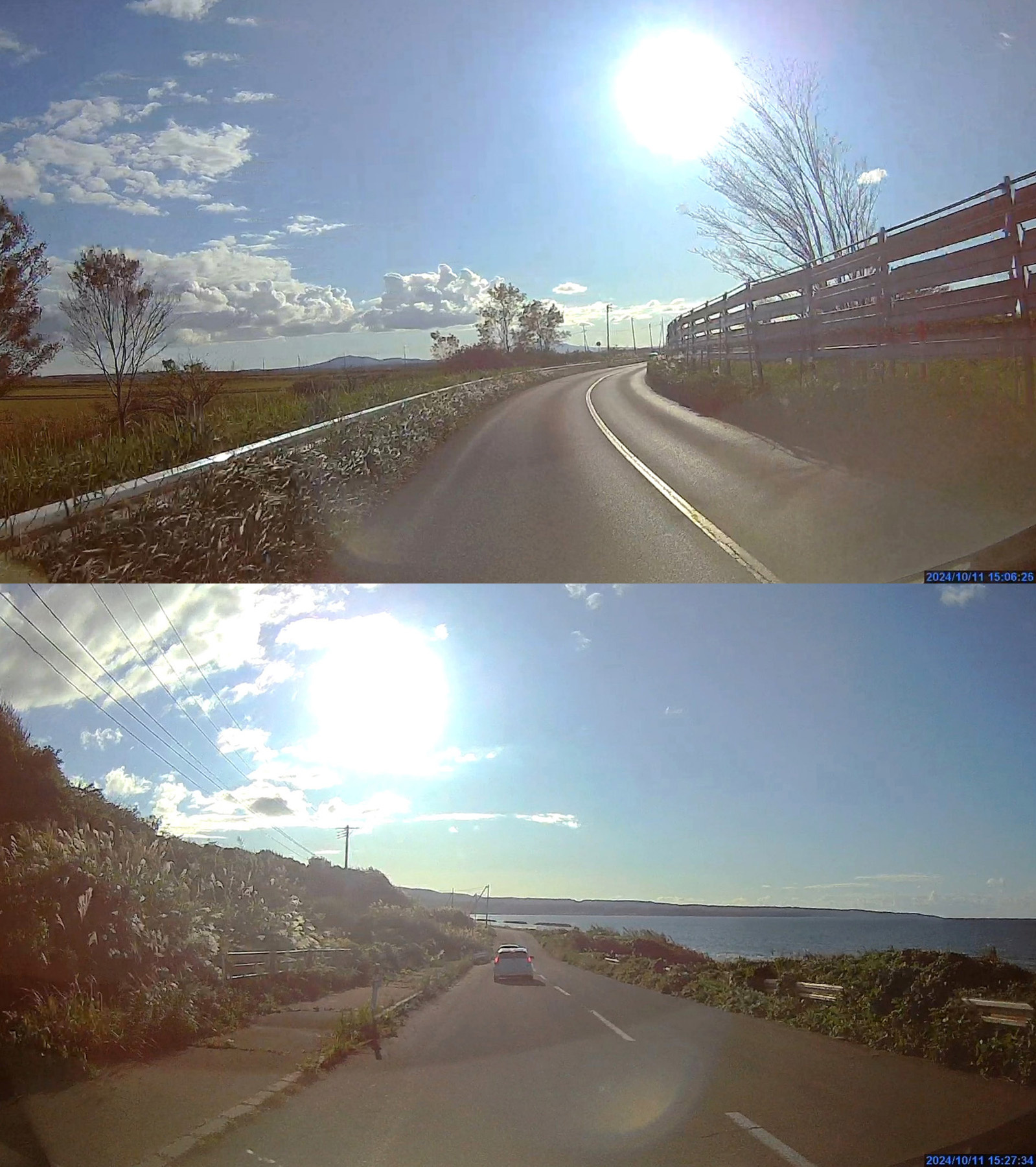 ![]() 八郎潟干拓地の縁を走り海岸沿いに出ました。この先に見えるのが入道崎なのでしょう。 |