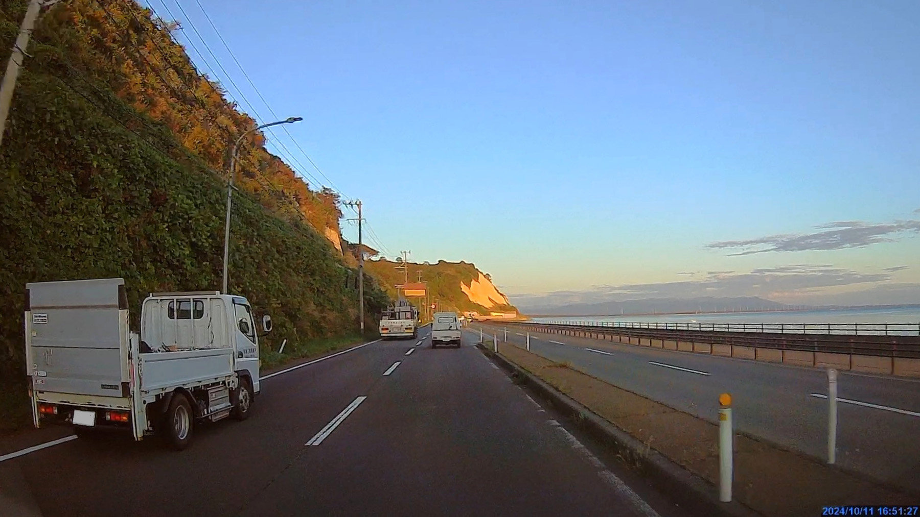 ![]() 秋田市へ向かって夕暮れの海岸沿いを走って行きます。 |