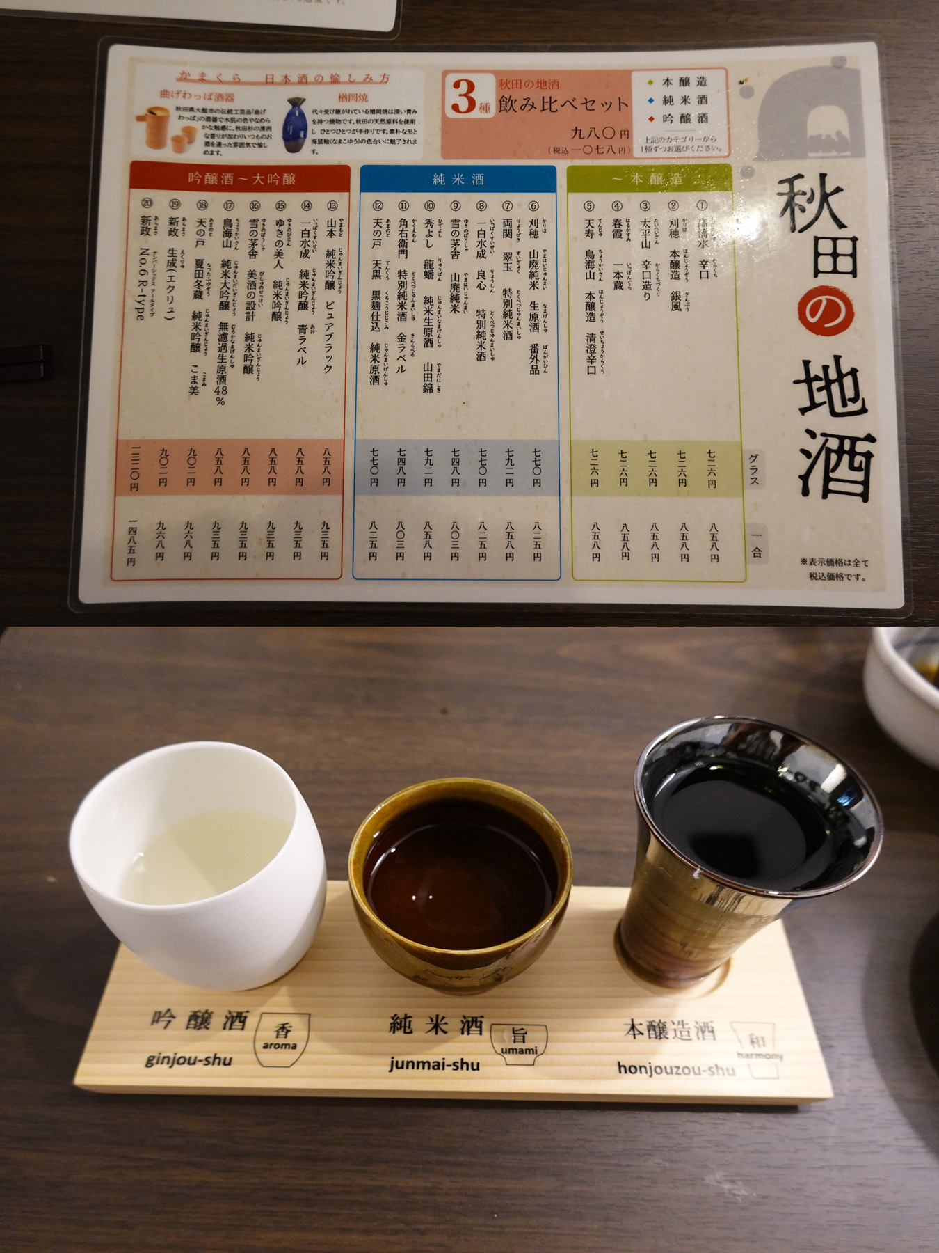 ![]() ここは飲み放題60分で980円なのですが、それでは面白くないので最初に地ビール(680円)を飲み、次にこの「秋田の地酒3種飲み比べセット」(980円)に挑戦しました。本醸造酒:春霞、純米酒:一白水成、吟醸酒:ゆきの美人にしてみました。 しかしこれが注文してからなかなか来なかった。2回ほど催促して40分ほどしてやっと出てきました。飲み放題の客から次々に注文が入り忘れられたのか?。店員は見るからに学生アルバイトでしたが。 |