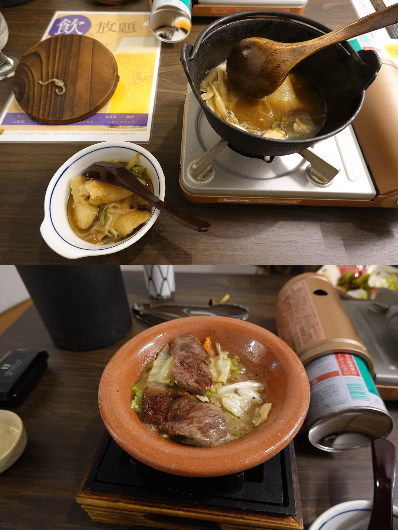![]() きりたんぽ鍋と追加で肉料理も食べました。 |