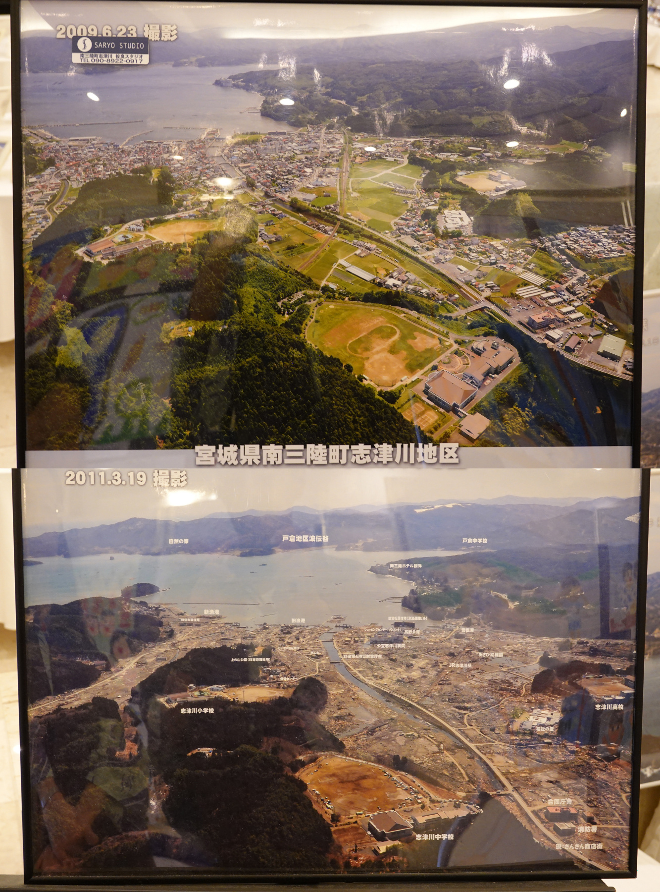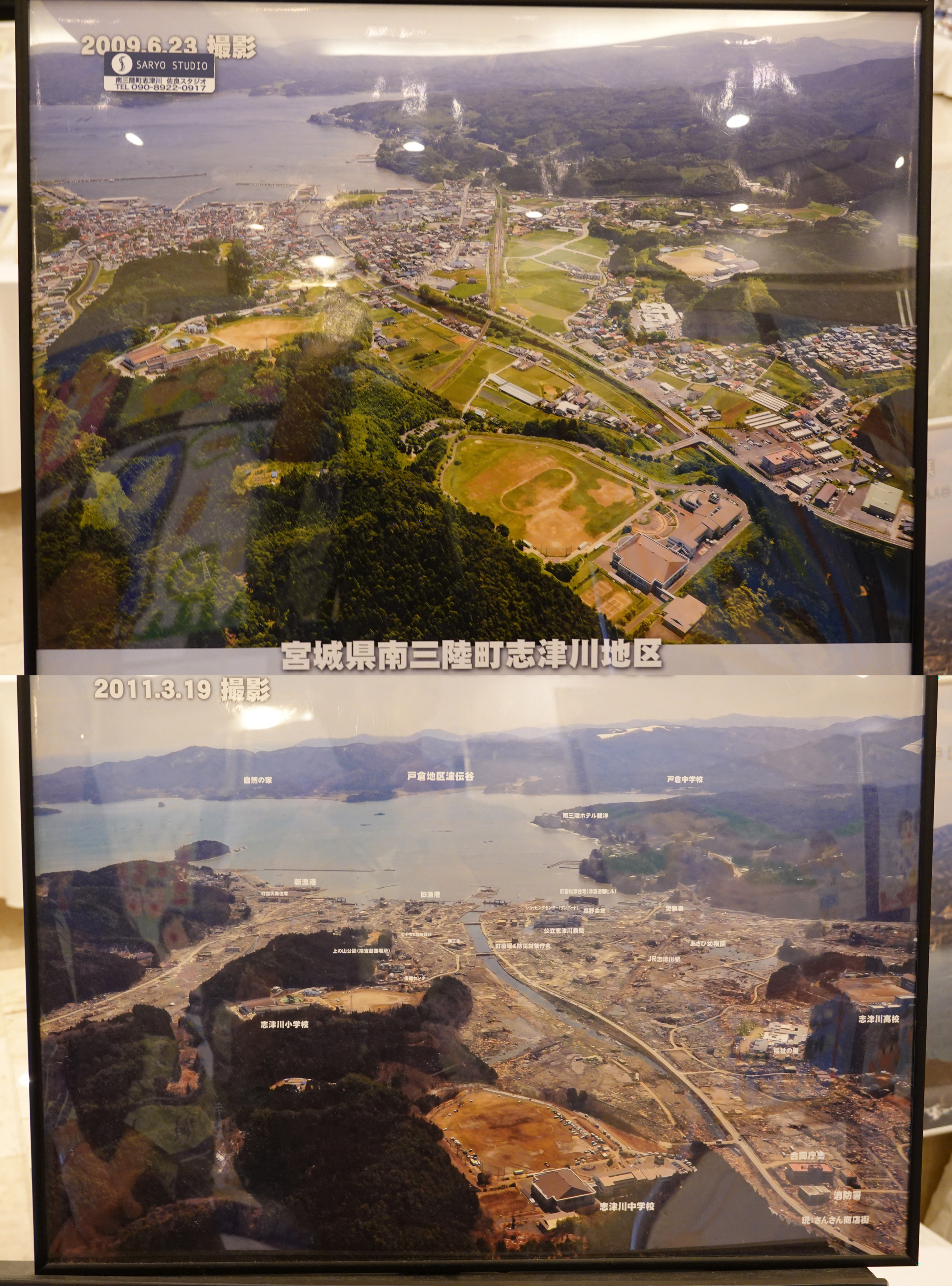 三陸町志津川地区の震災前後の写真。ホテルの位置は下の写真の中央やや右上です。下層階は被害を受けたが上層階は無事だったようです。岬の陰になっていて津波の直撃は回避できたのかも知れません。