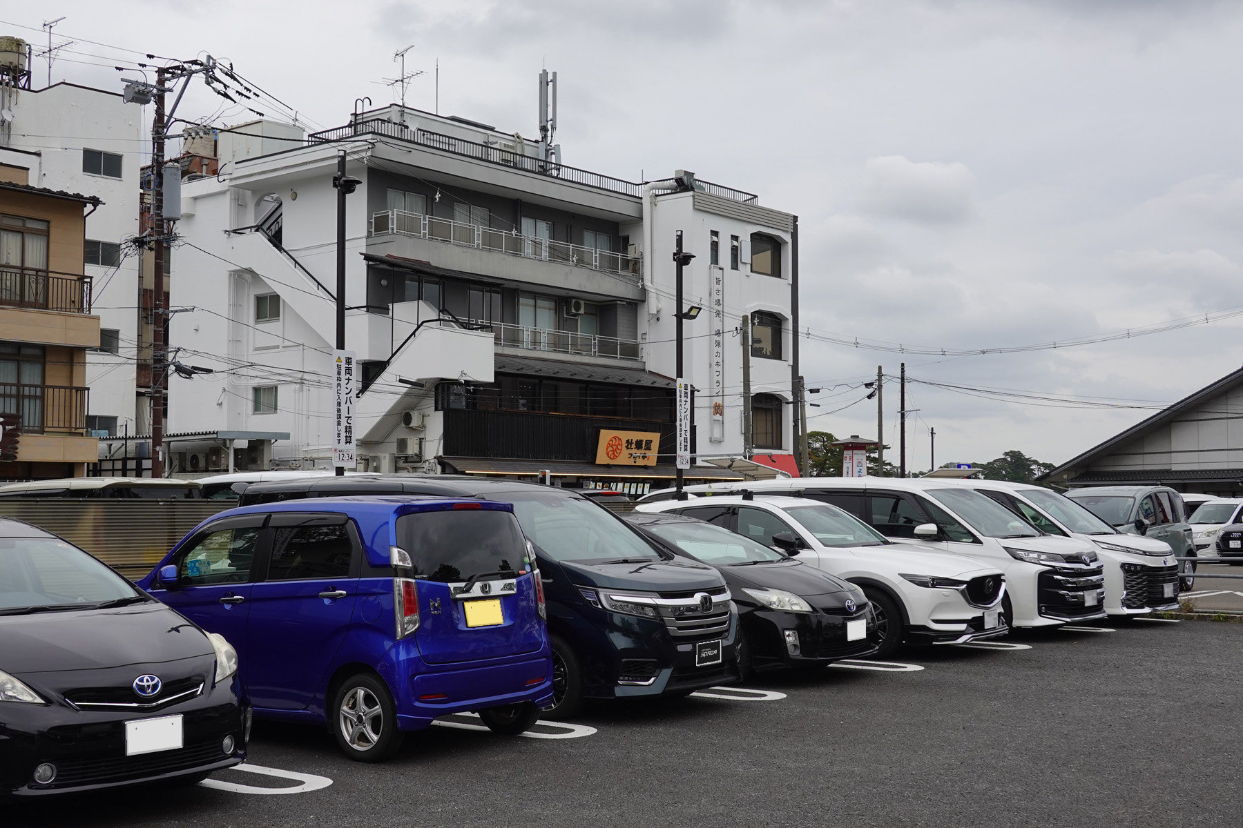 駐車場の位置が事前にはよくわからなかったが、ホテルの右側から入ったところが第1で左側の道路沿いが第2のようです。誘導に従い第1の右奥に駐めました。