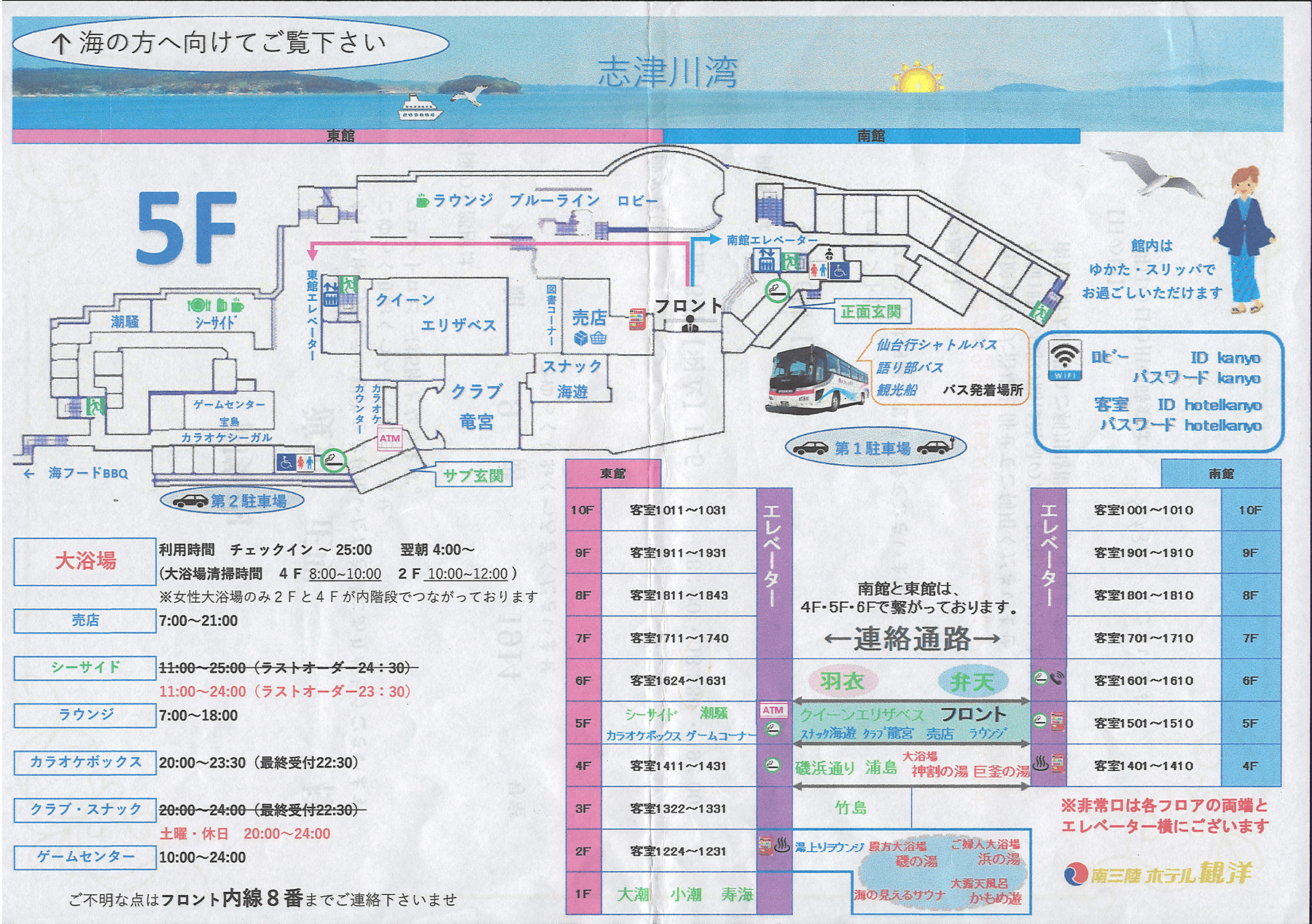 館内マップです。断崖に建っているので道路沿いのフロント・ロビーが5階、レストランが6階で露天風呂付きの大浴場が2階です。