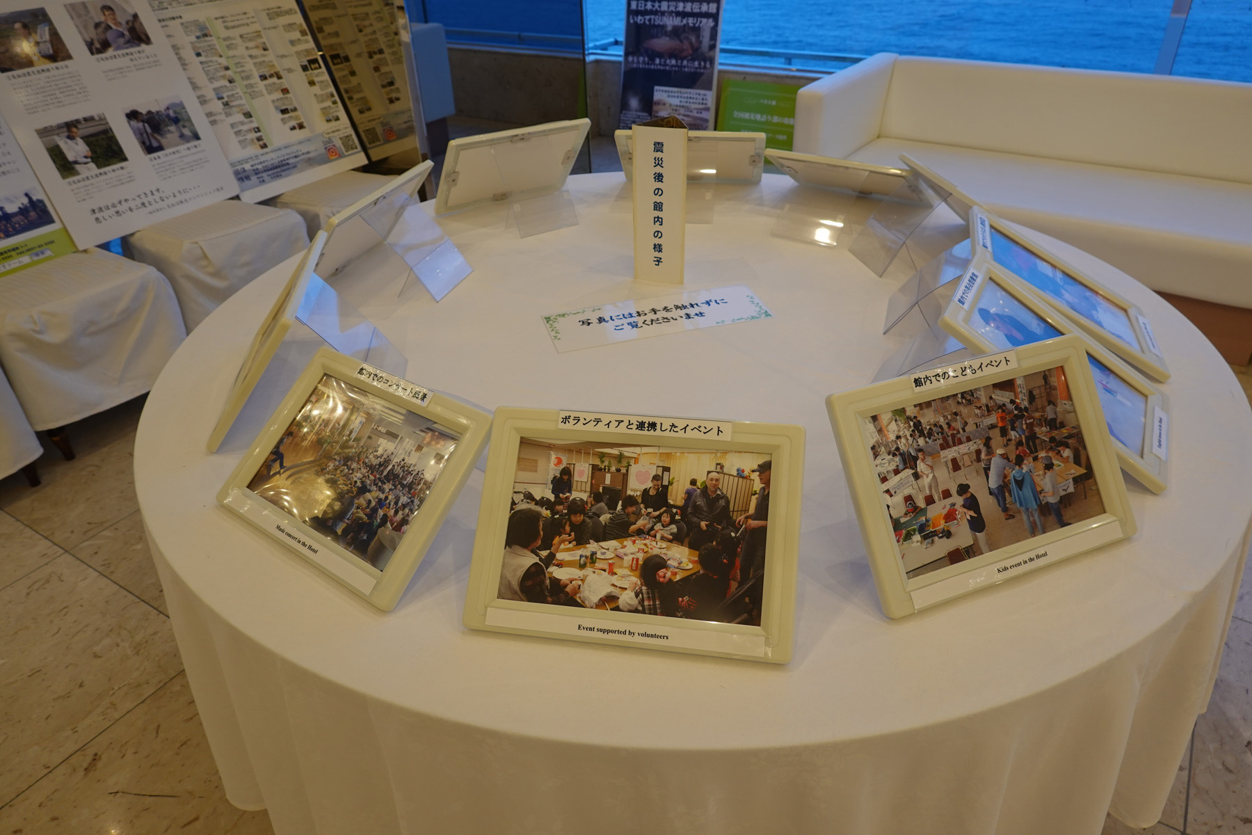 【全天球写真】このホテルは震災時に数百名の被災者を受け入れていた事で有名で、ラウンジの奥には震災関連の展示コーナーがあります。