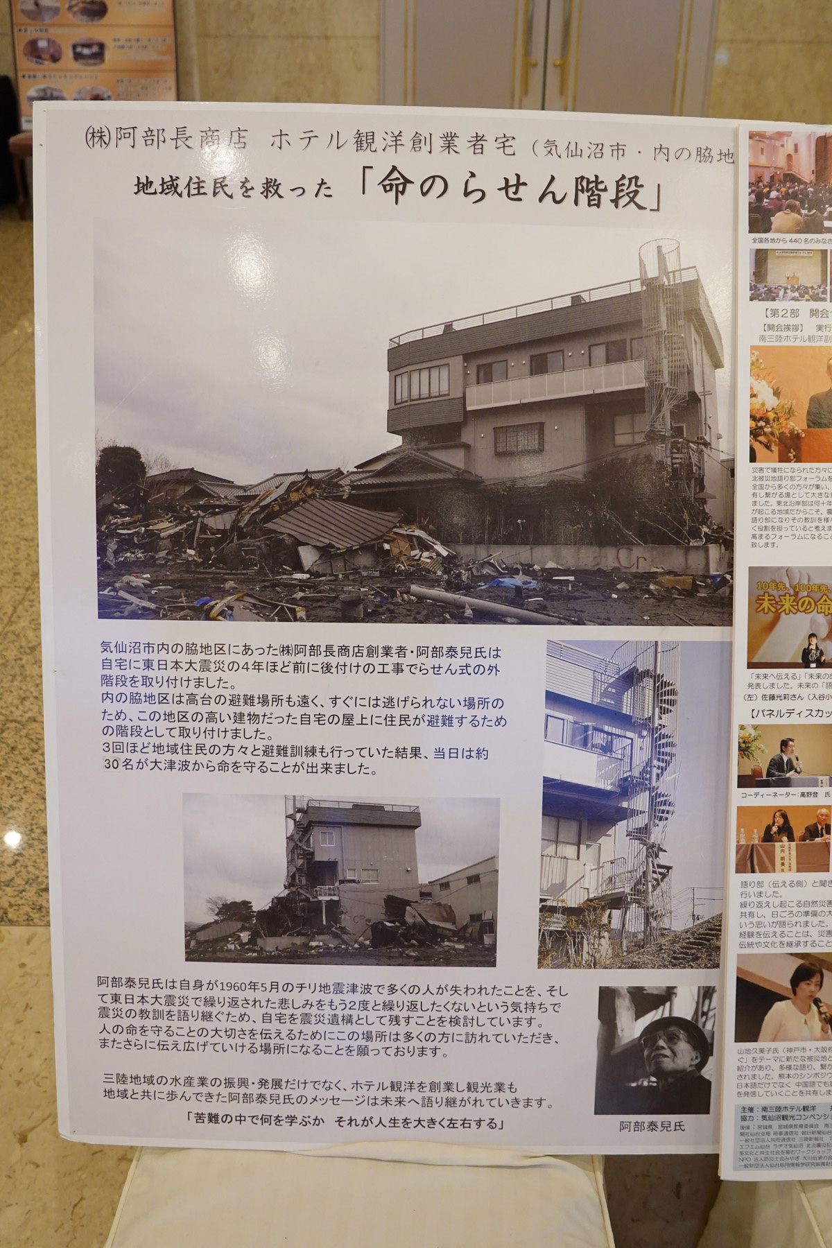 ホテル創業者の自宅には震災の4年前にらせん式外階段を取り付けていて、約30名の命が助かったそうです。
