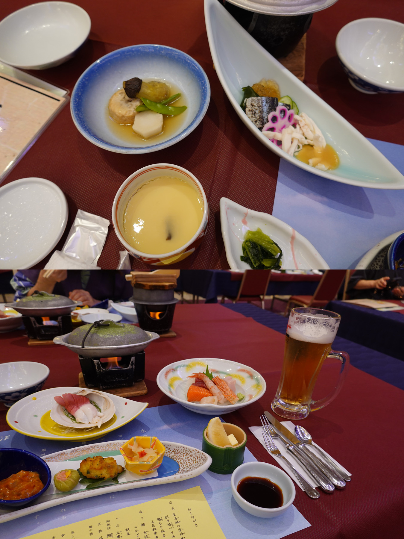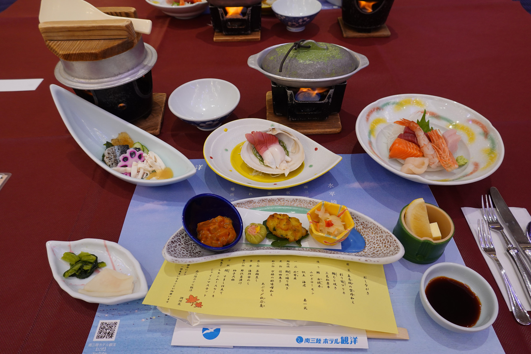 夕食です。宿泊コースが「新鮮アワビが丸ごと1個!踊り焼でご賞味あれ」だったのでアワビが付いてます(中央上の鍋状のもの)。