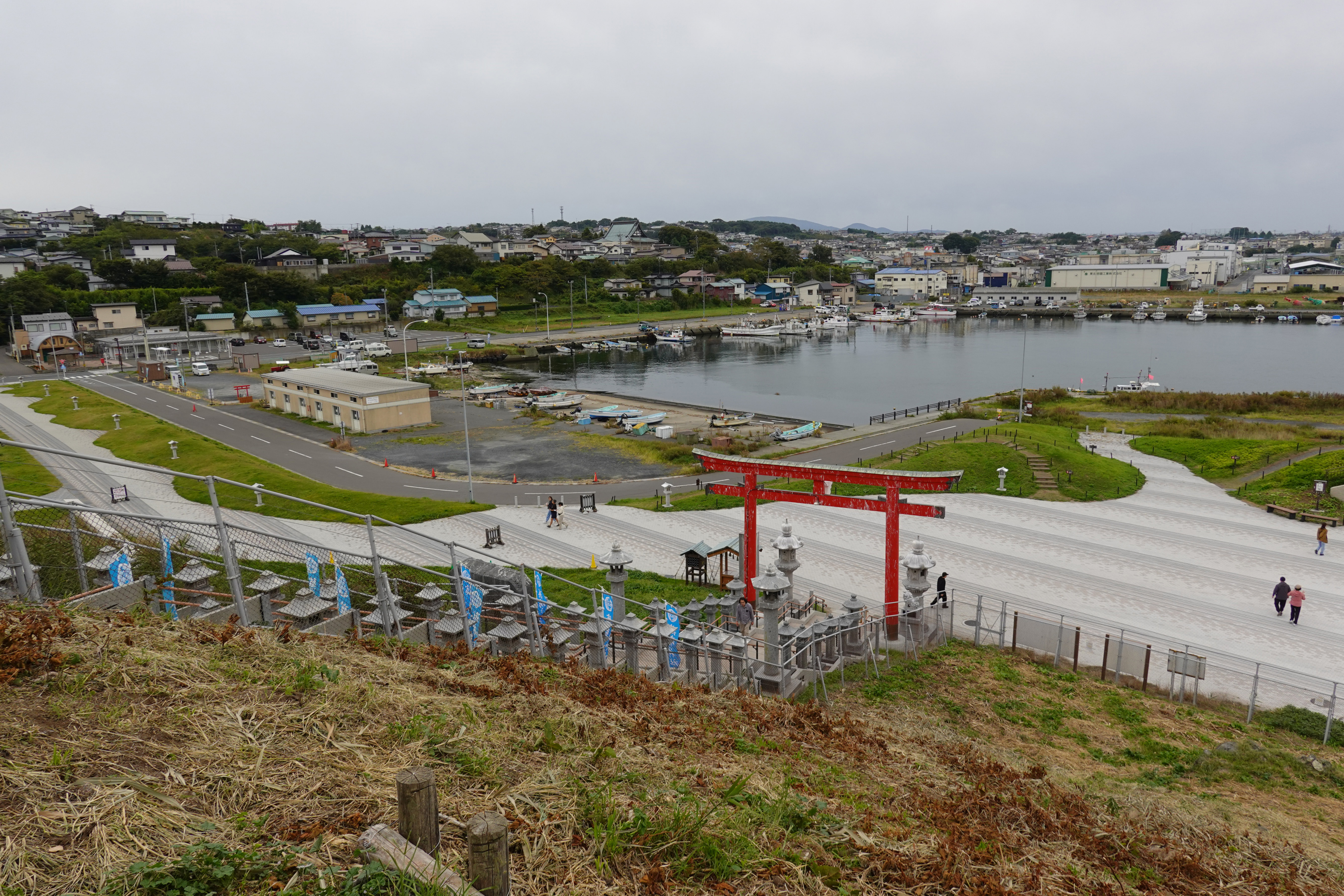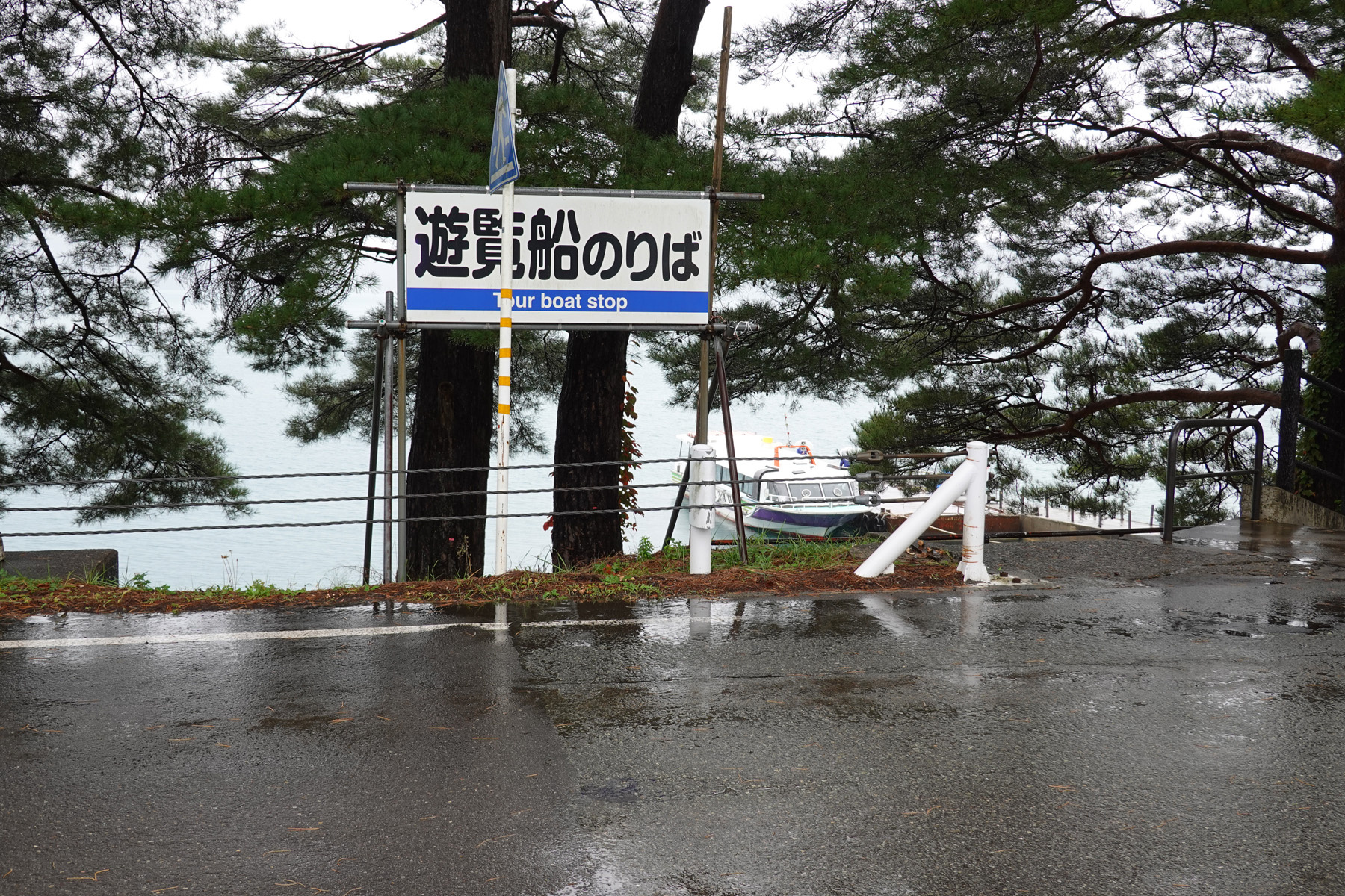 元に戻って神社登り口と駐車場方面です。港に船が停泊してます。