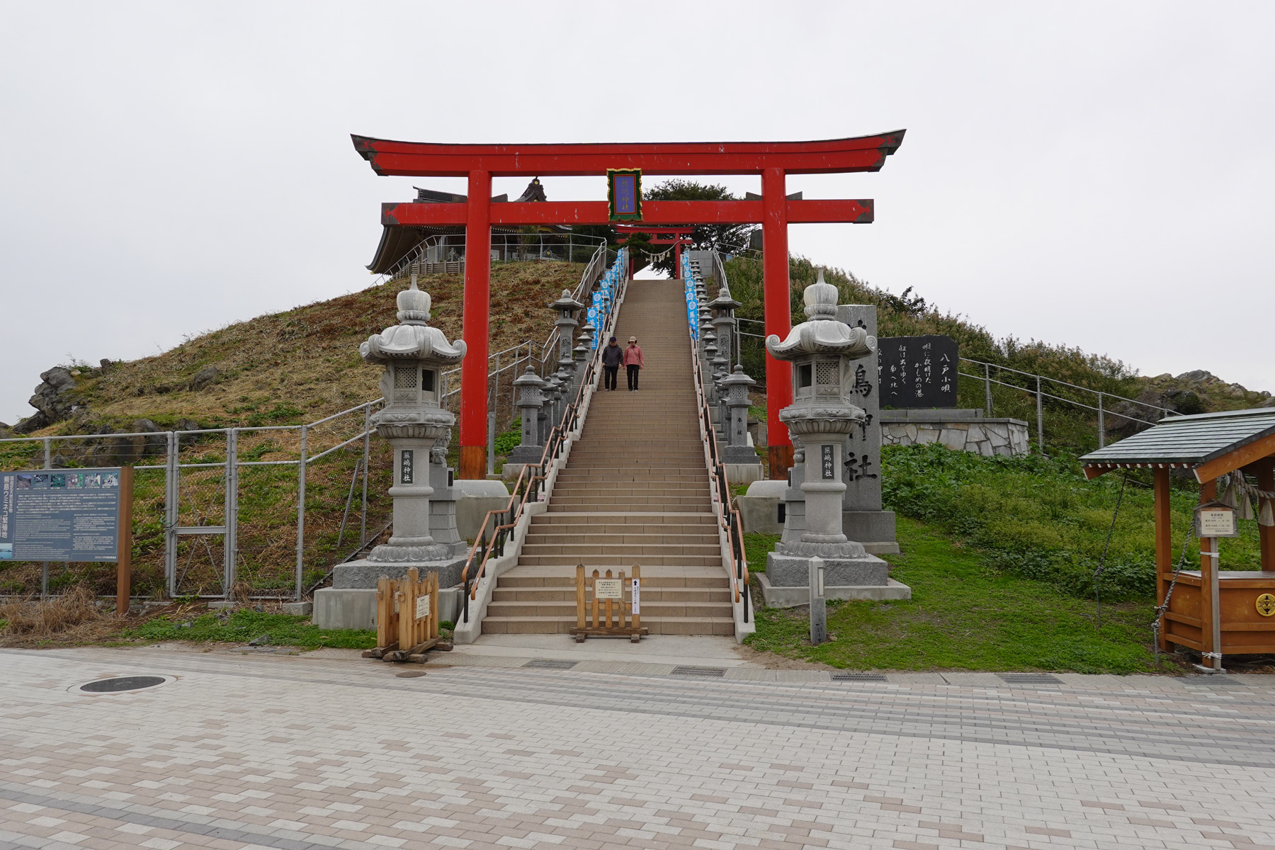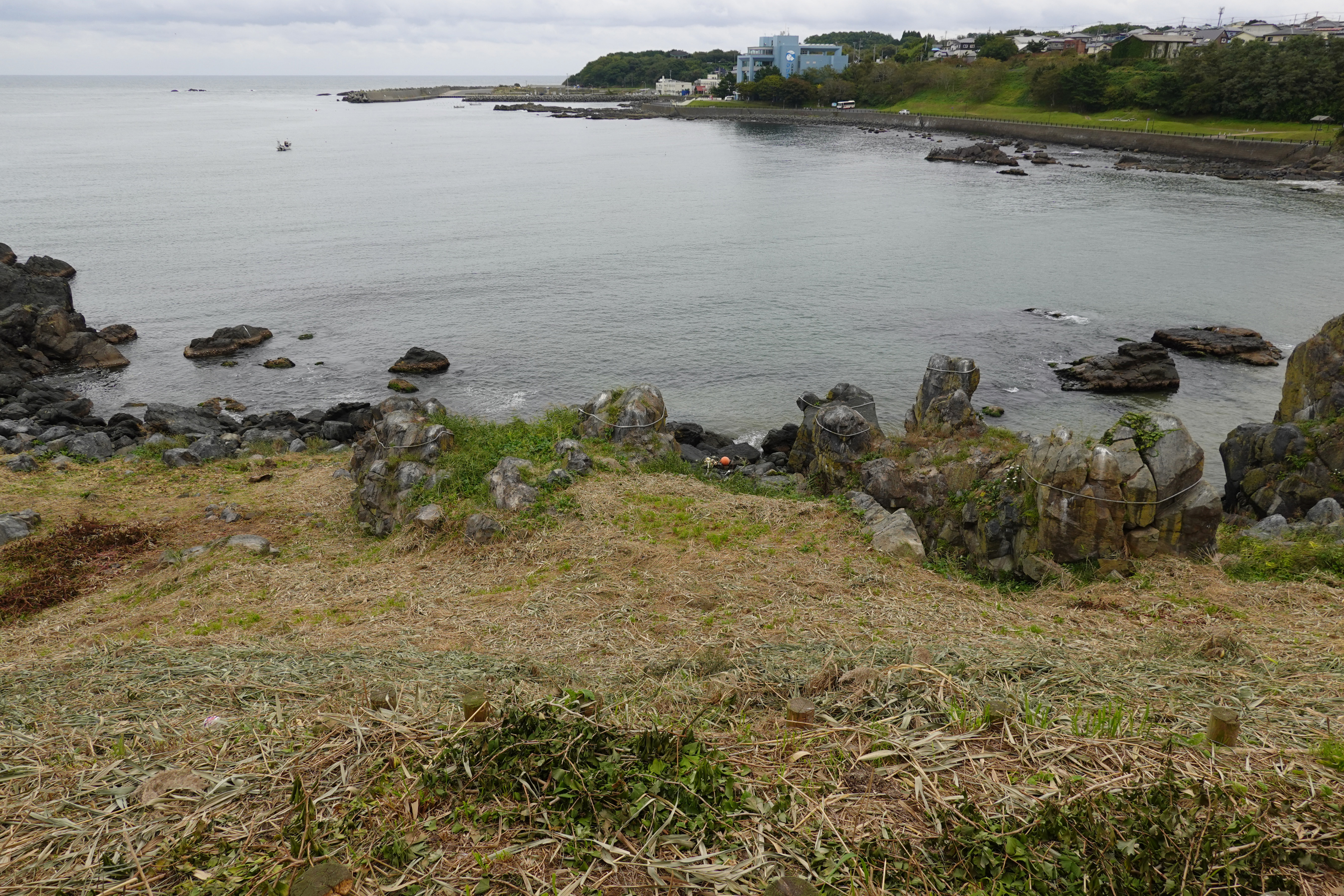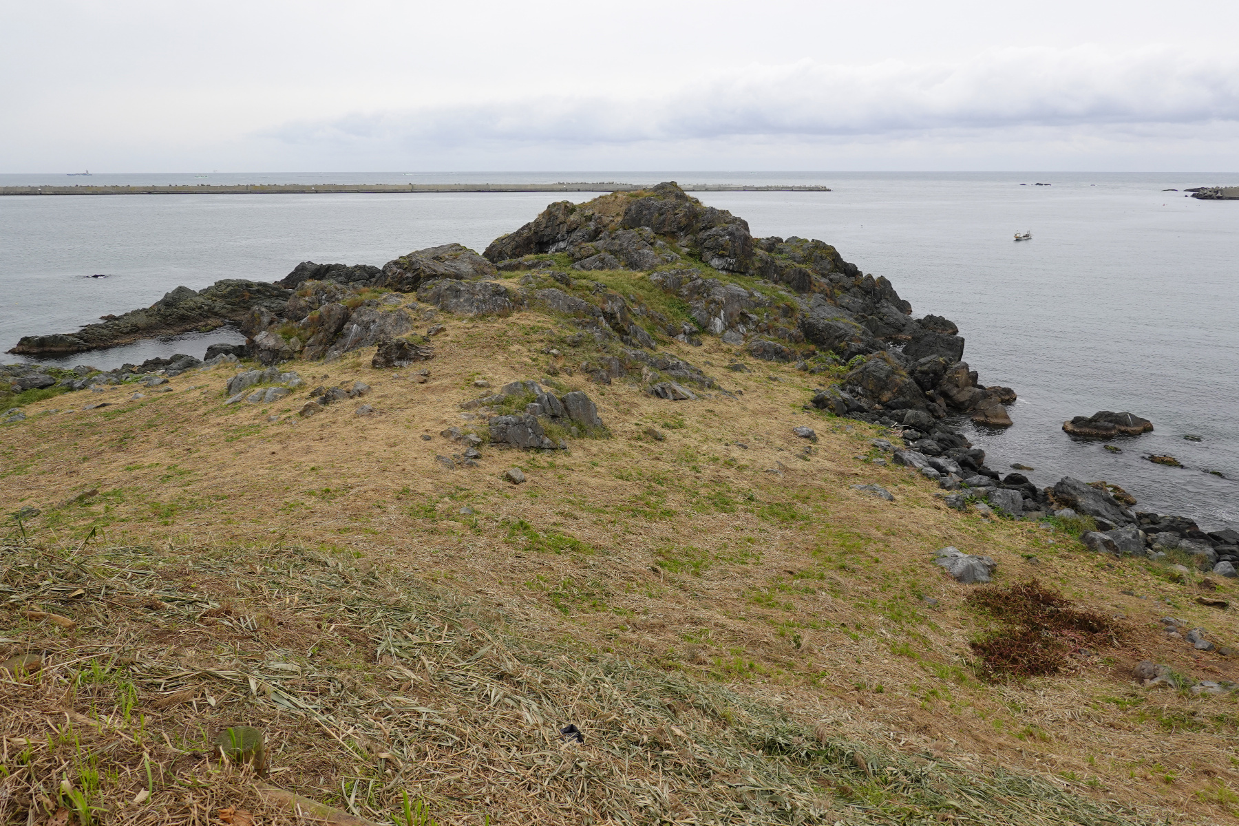 神社の裏手側。このあたりがウミネコ繁殖地として有名で多い時には3〜4万羽いると言うので楽しみにしてたのですが、1羽もいません。この季節は南の方へ渡ってしまっているようです。