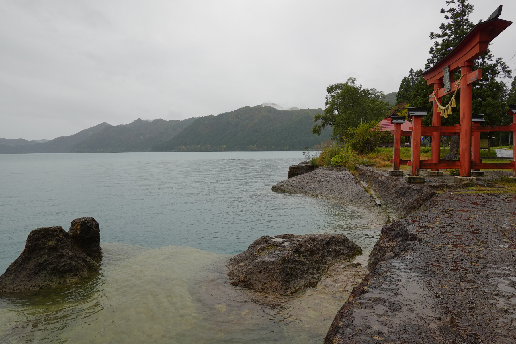神社から岸辺に下りて見えた田沢湖。チラッと紅葉が始まっています。