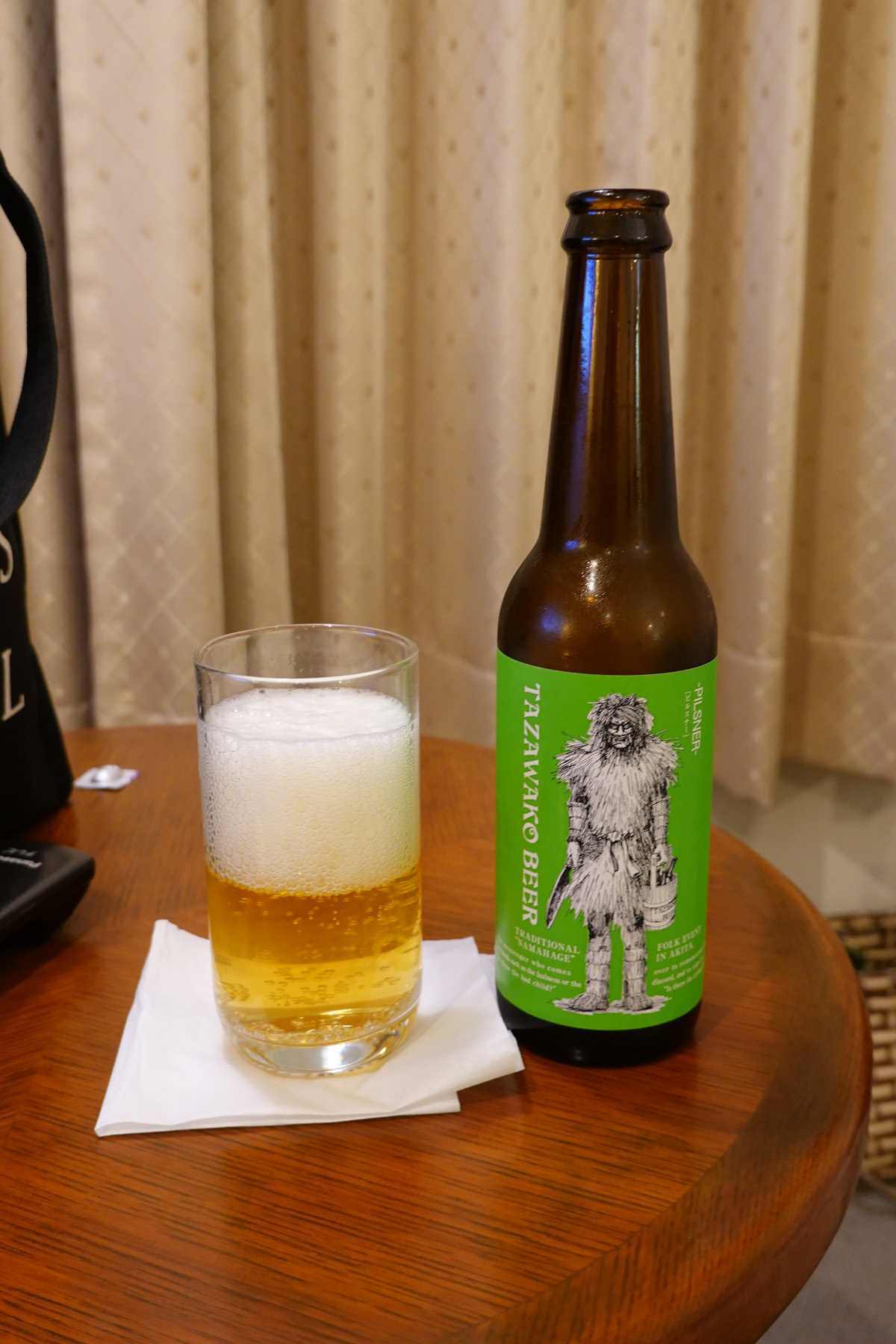 部屋に戻って温泉に入ってから田沢湖ピールの「ピルスナー」を飲みました。ビールの自販機はなくフロントでの購入です。