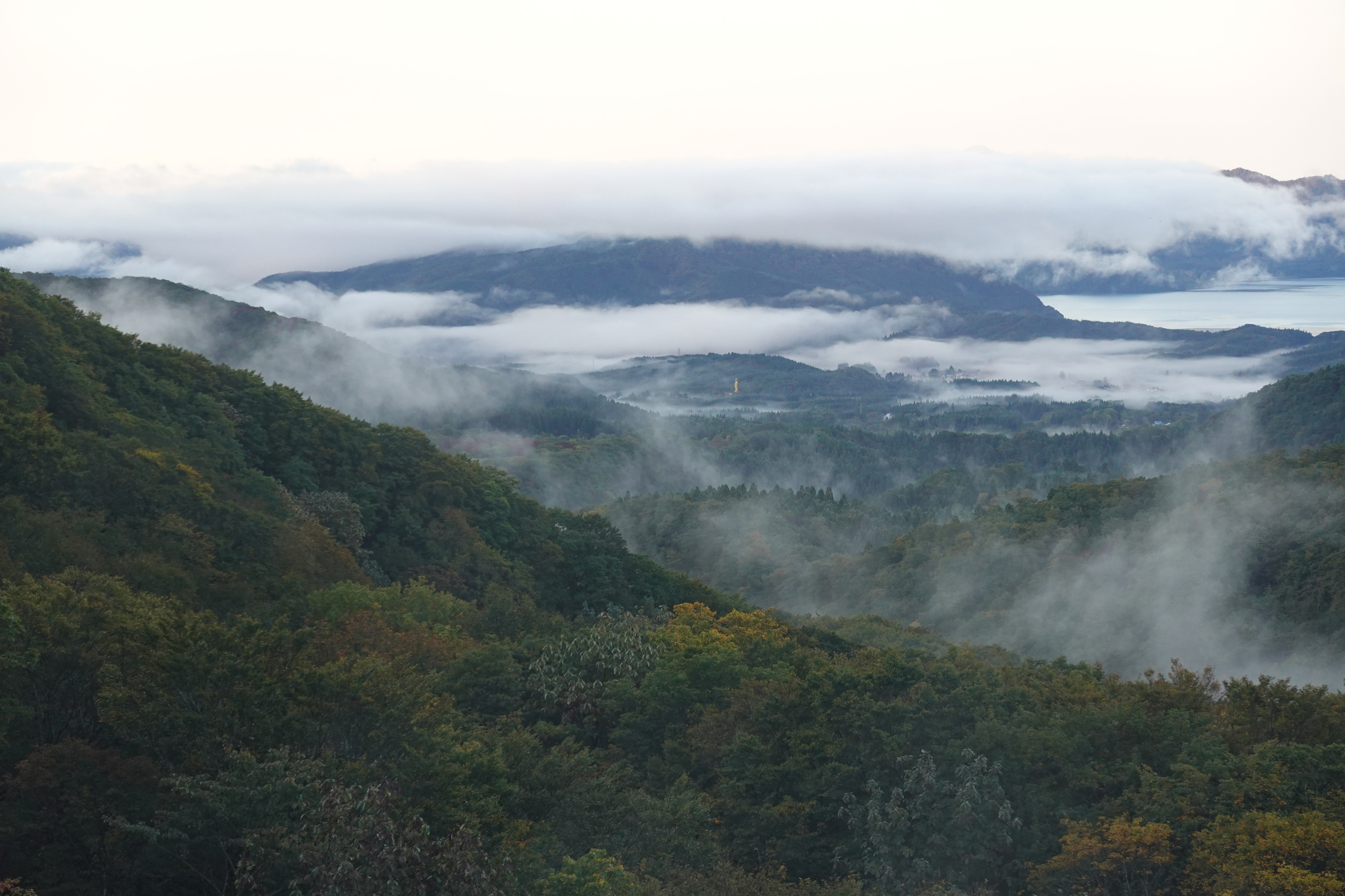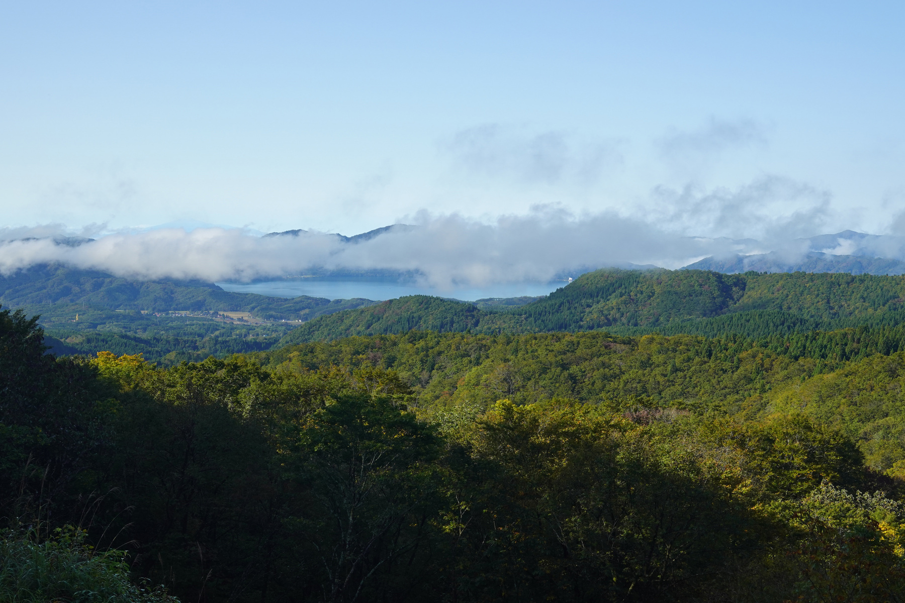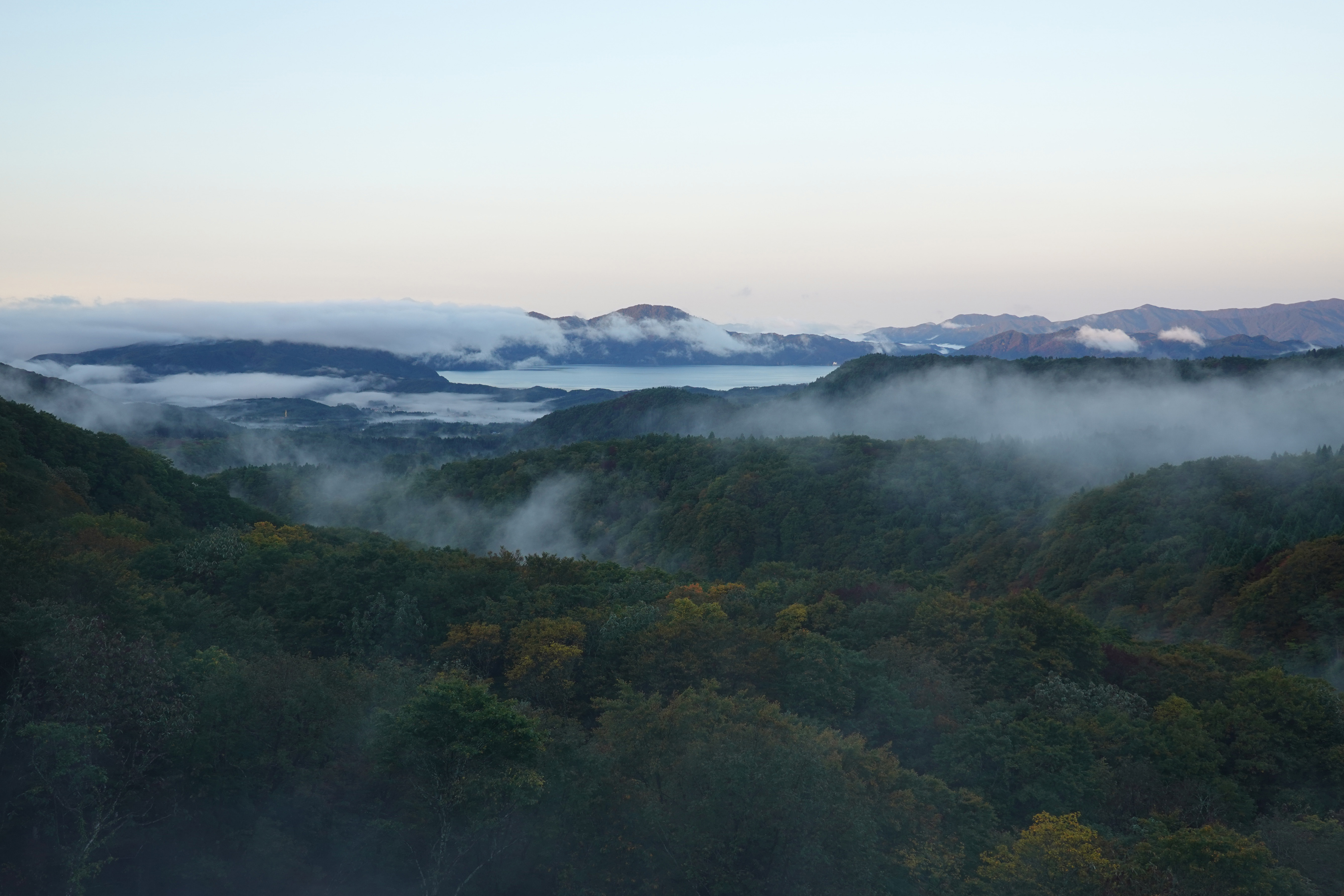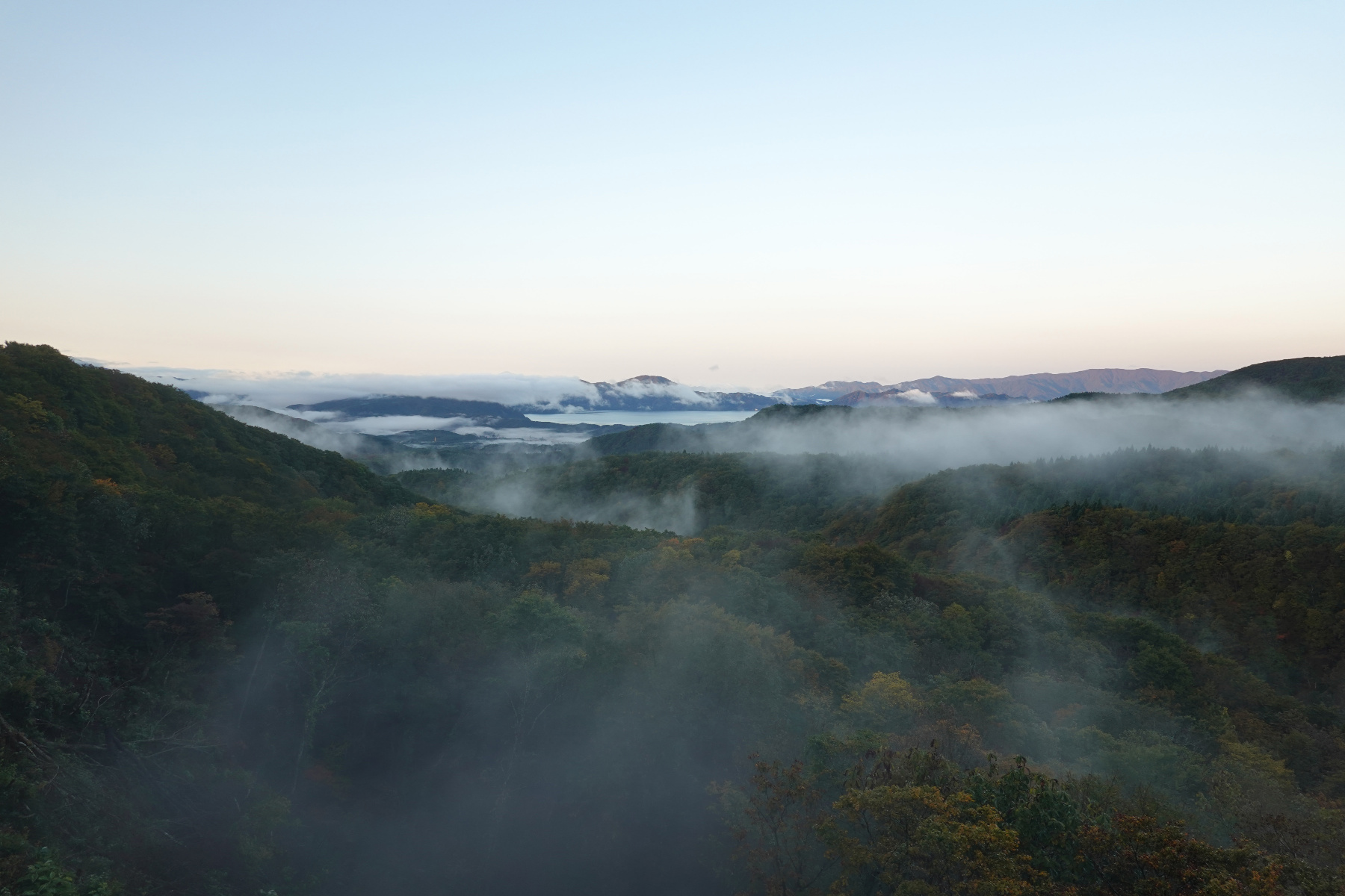 ![]() ホテルの窓から見えた夜明け前の田沢湖。雲がたなびいてますが湖は良く見えます。 [高解像度写真] |