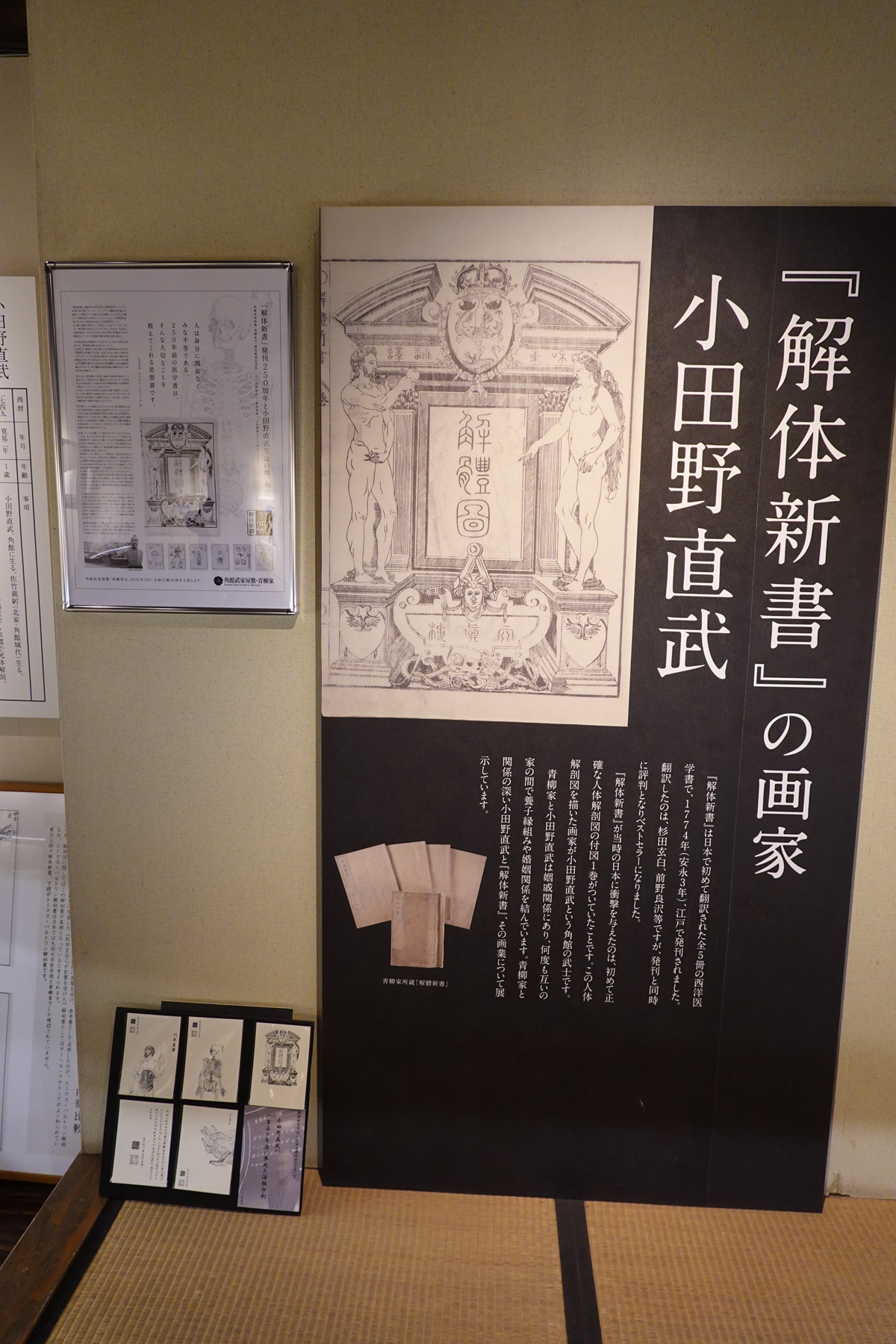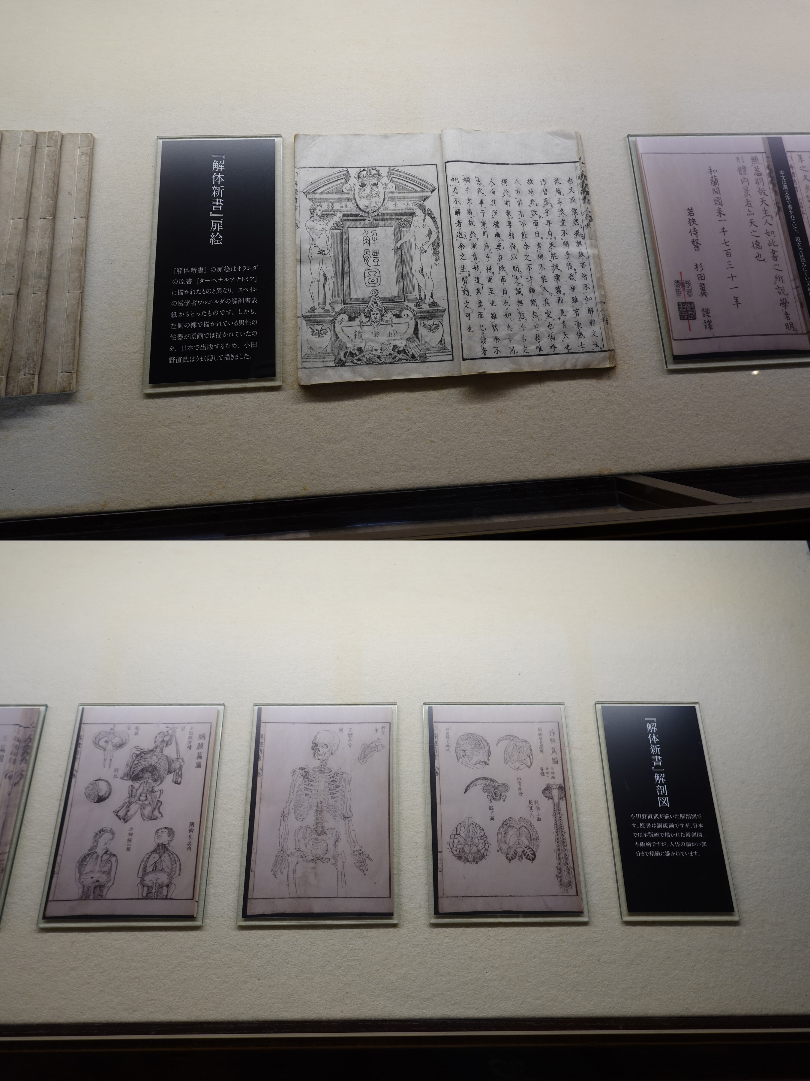 ![]() 解体新書の扉絵や解剖図が展示されています。 [高解像度写真] |