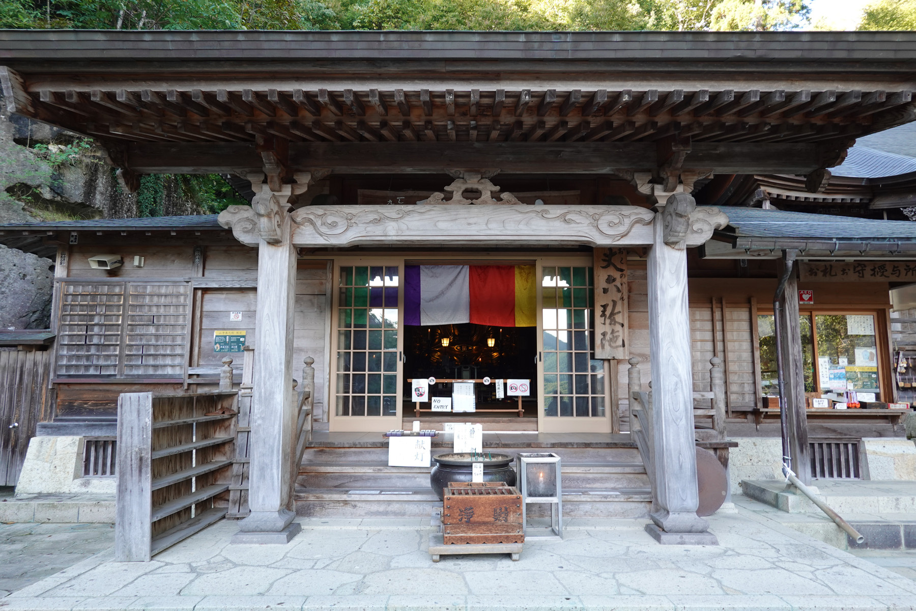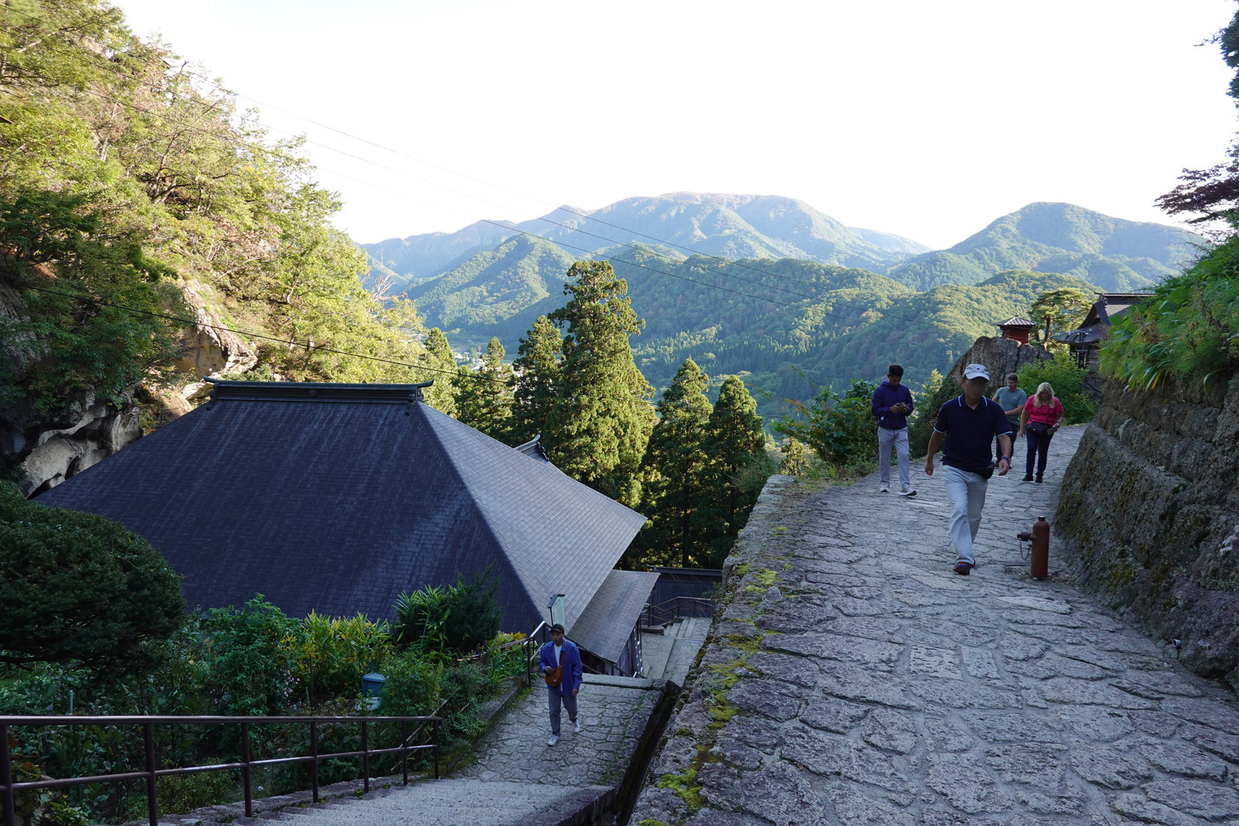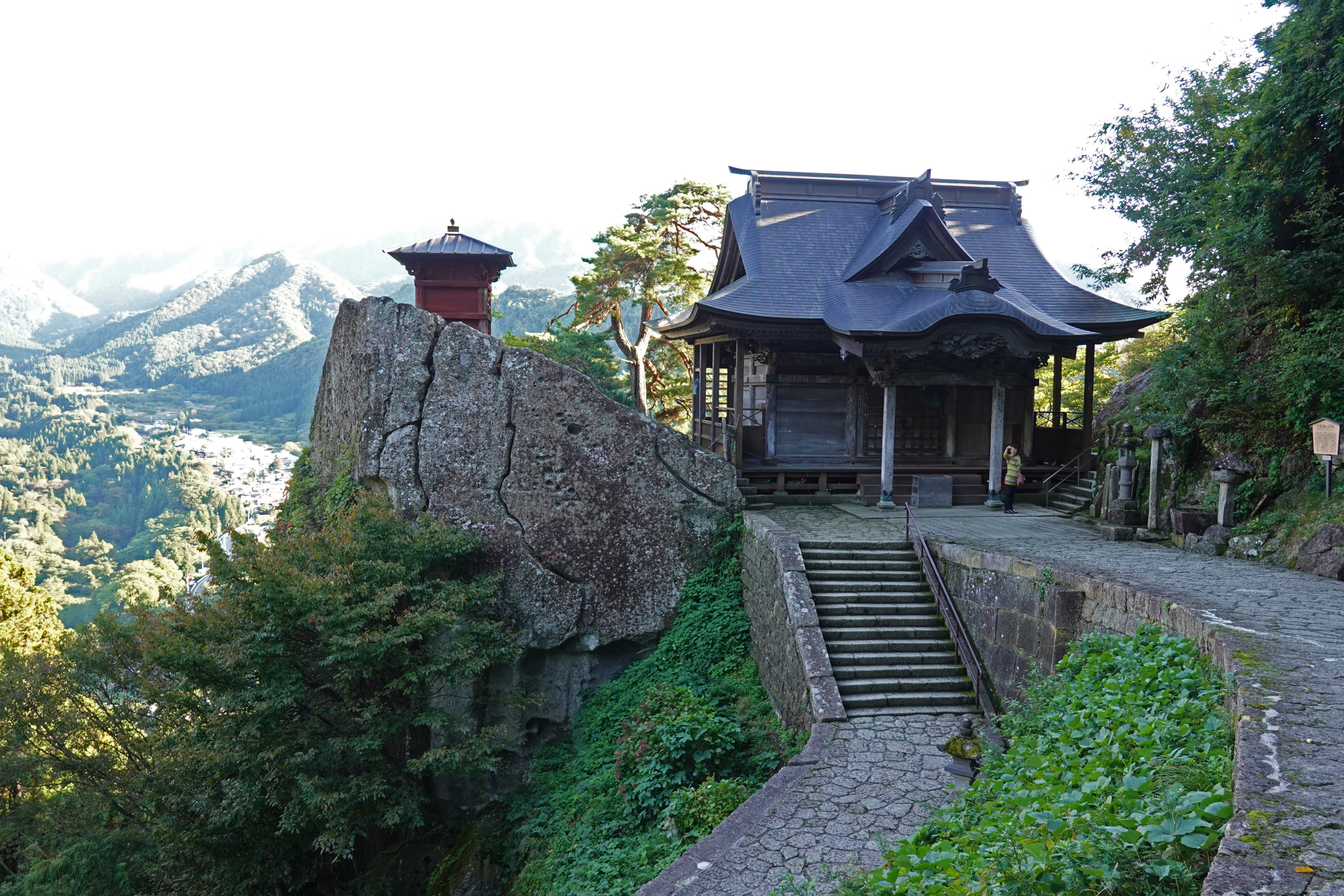 ![]() 少し下ったところの納経堂(左)と開山堂(右)です。山寺を代表する景観です。 [高解像度写真] |
