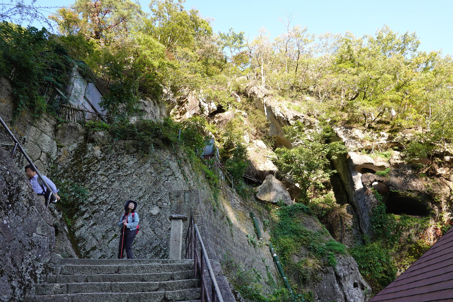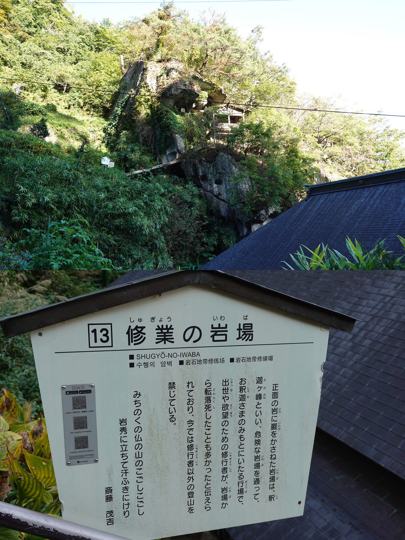 ![]() 修行の岩場がありました。たぶんこの先に見えているところだと思います。転落死が多かったとか。 |