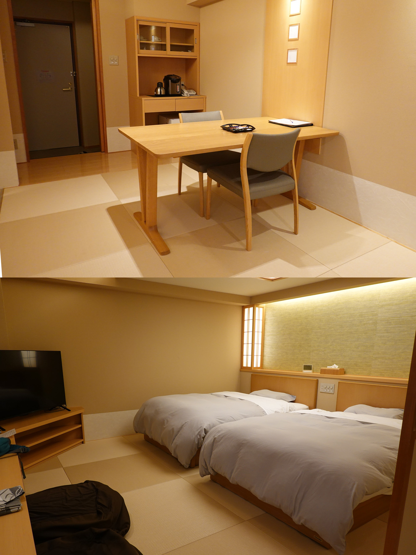 ![]() 部屋は2024年リニューアルの新和風調ツインとかで広々綺麗でした。「山形の郷土料理をお部屋でどうぞ」プランなんですが室内には座卓ではなく食卓机があります。 |