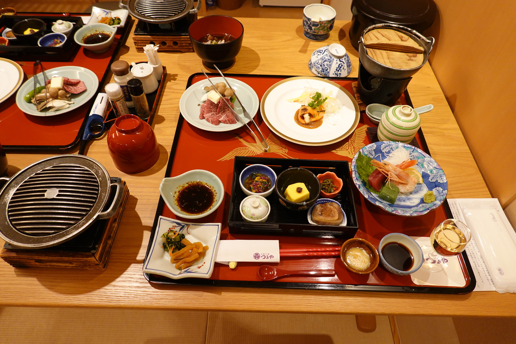 ![]() 夕食は巨大なお盆が部屋に運ばれてきました。食べた後で持ってみたけどすごく重かったです。持ってきた仲居さんは超力持ちです。 |