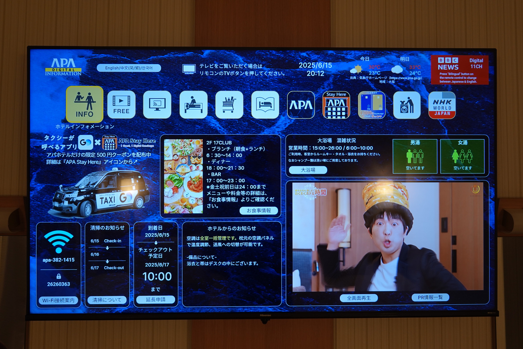 部屋に入ってルームキーで照明をつけるとテレビの電源が入り各種情報が表示されます。WiFiのパスワードや大浴場の混雑状況も表示されています。