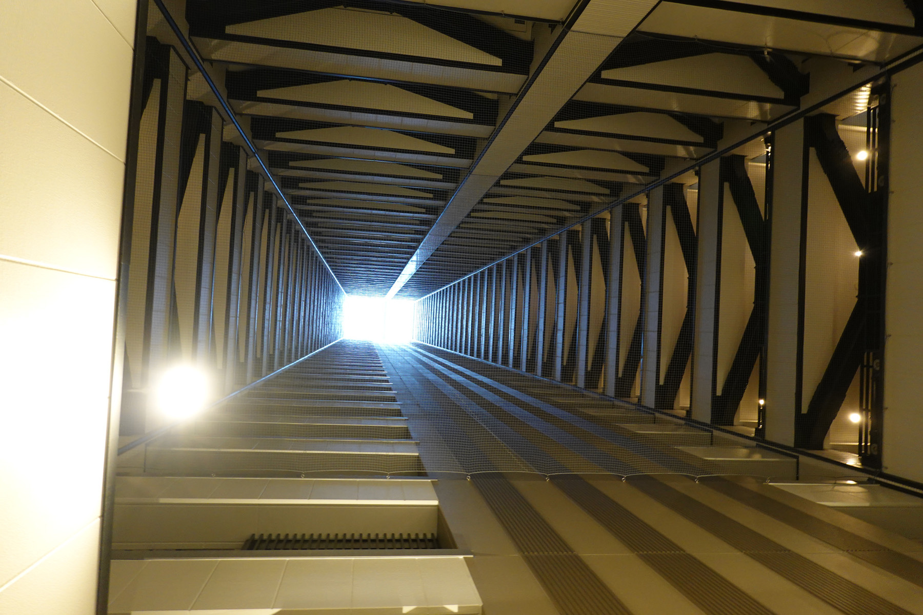 吹き抜け部には屋根がなく通路途中にも外壁がないので、通路部は冷暖房なしで台風の際は雨が吹き付けるのではないかと思います。