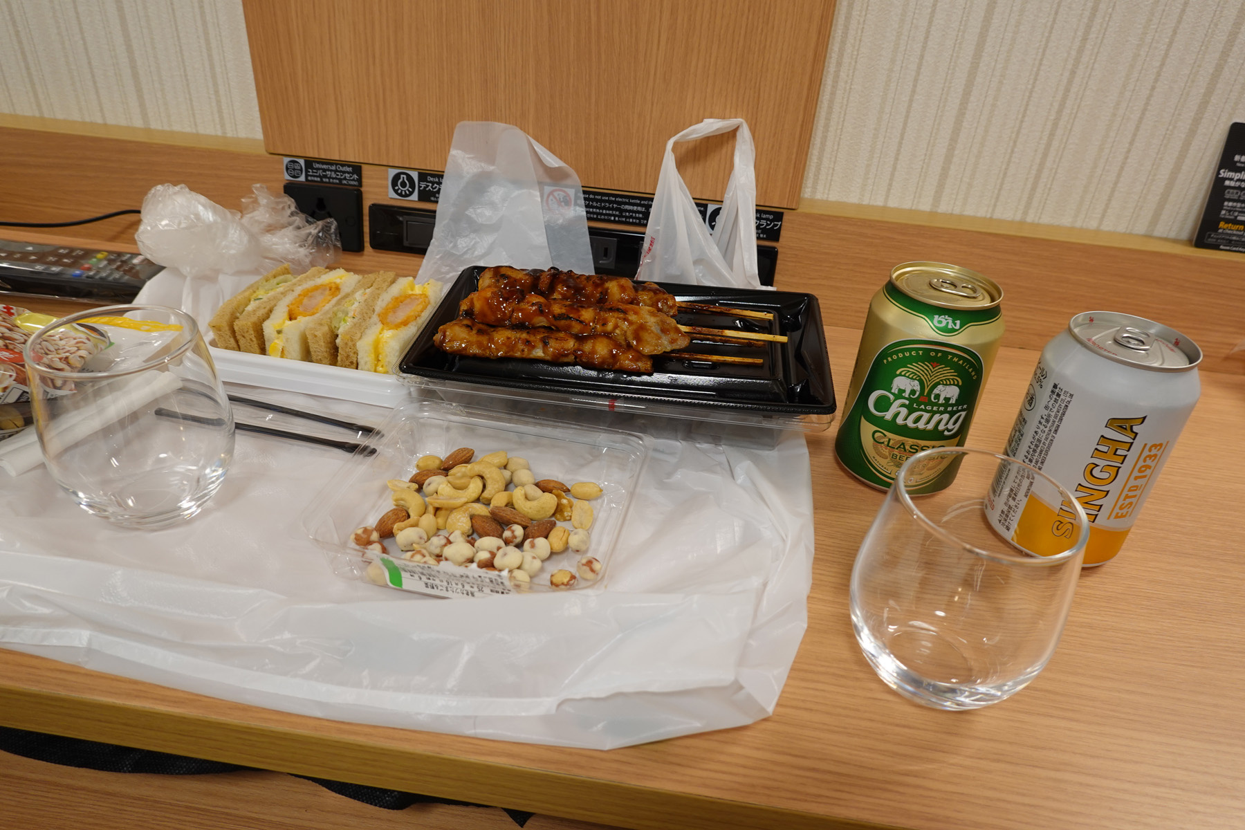 夕食は近くのスーパー(ライフ)で焼き鳥とサンドイッチを買って部屋で食べました。ビールは何故かあったタイビール。