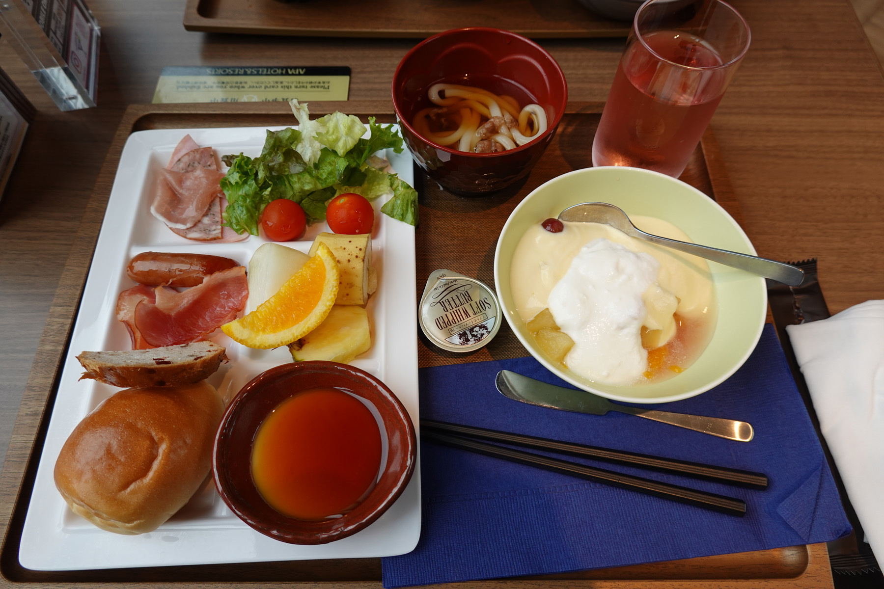 ![]() アパホテルでの朝食2日目。昨日2×4のトレーを使ったら大きな食器が乗せにくかったので今日は2×3のトレーにしました。 うどんがあったのでちょっとだけ食べてみました。 |
