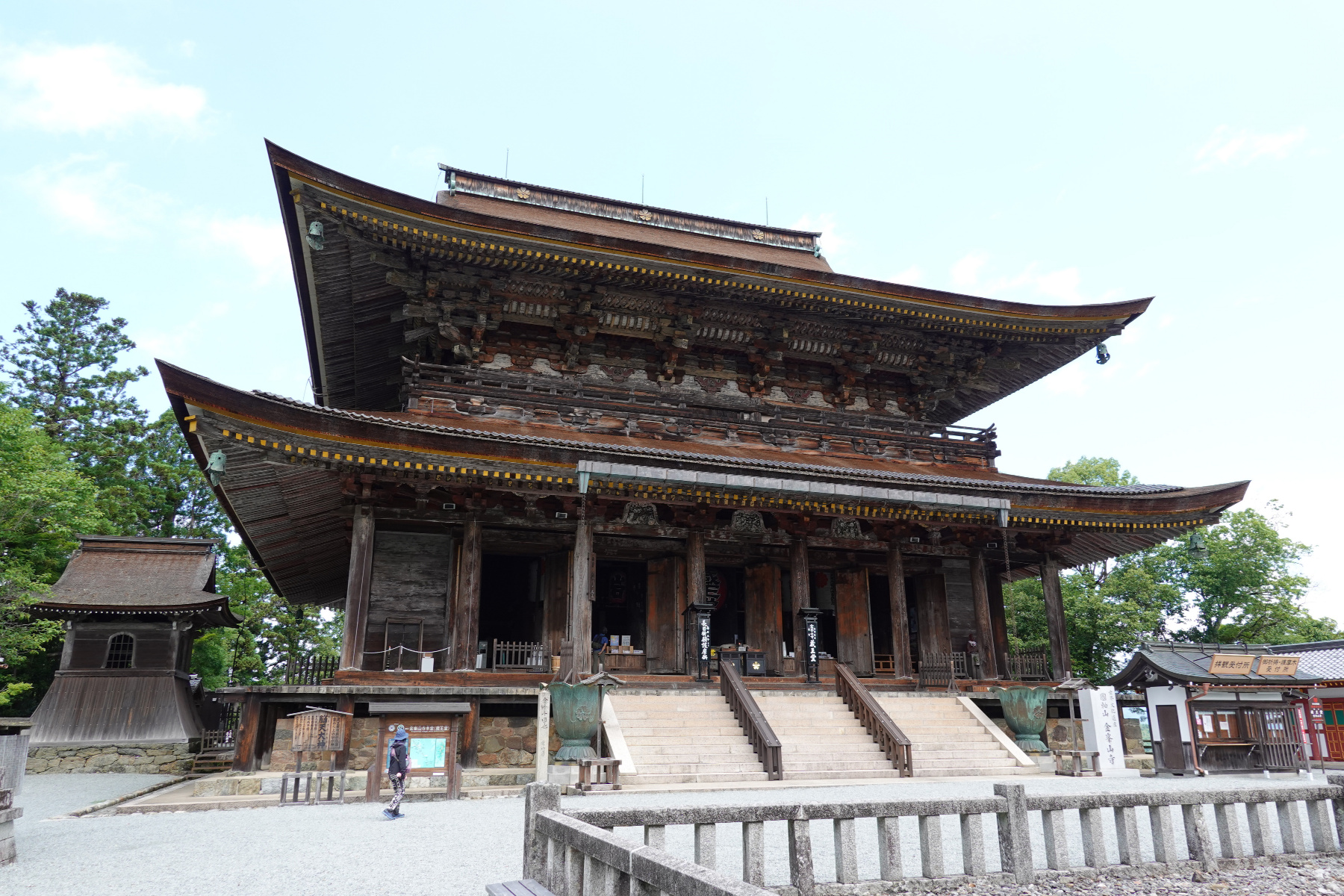 ![]() 金峯山寺に着きました。本堂でもある蔵王堂です。高さ34mの桧皮葺きの本堂は奈良の東大寺大仏殿に次ぐ大木造建築だそうです。 [高解像度写真] |