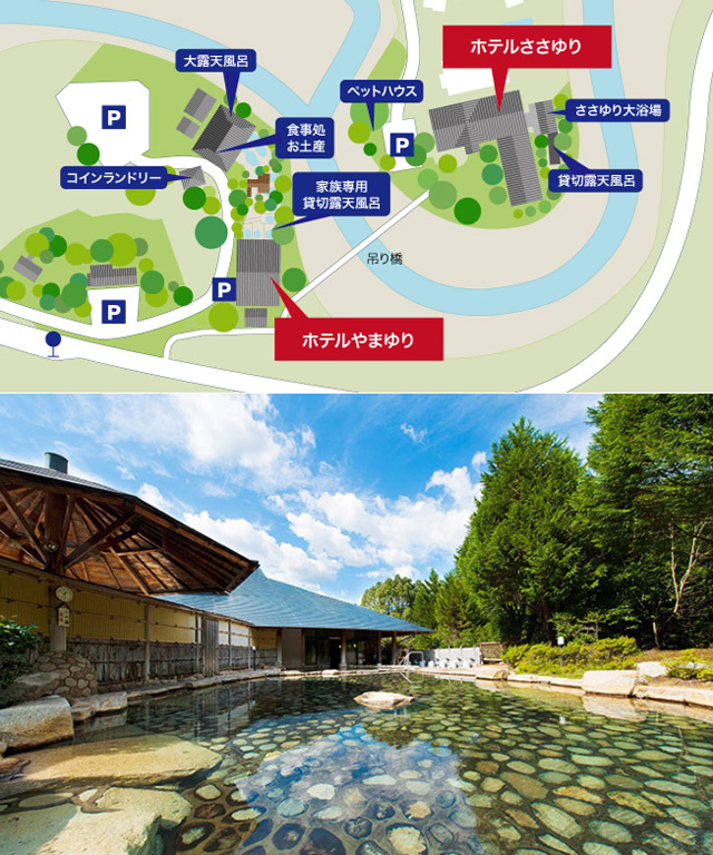 ![]() このホテルは、やまゆりとささゆりがあり吊り橋で繋がっています。やまゆりには大露天風呂(写真下)、ささゆりには大浴場があり、どちらに泊まってもどちらにも入浴可能です。 大露天風呂は日帰り客も来ていてその場合は入場時に料金を払いますが、宿泊客はホテルの浴衣を着ているとフリーパスと言う仕組みでした。 |