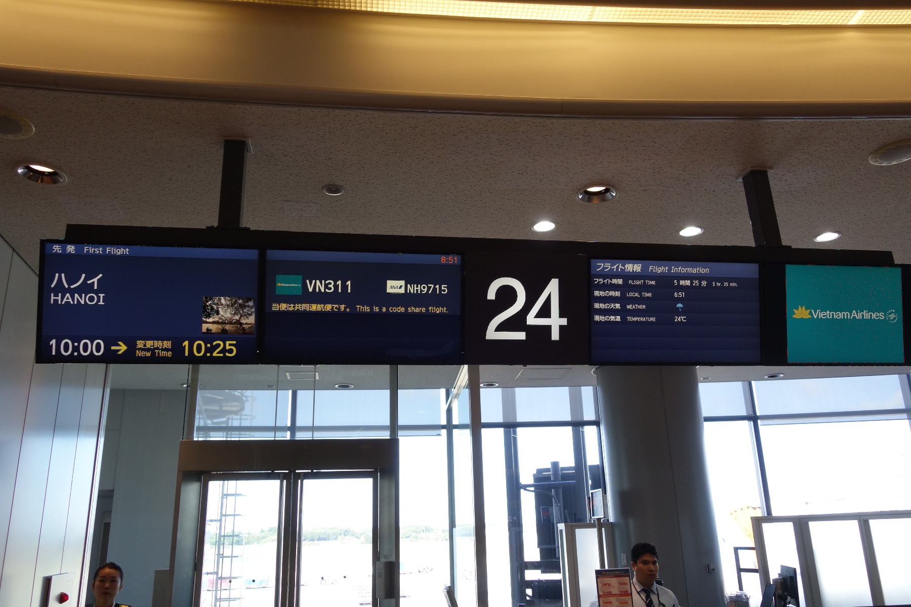 各種手続きも順調に進行し搭乗ゲートにやって来た。出発時刻が10:00から10:25に変更になったので(この件は前日JTBから連絡があった)、まだかなり時間がある。なお、ハノイでの乗り継ぎは余裕があるので出発遅れは問題無いとのこと。