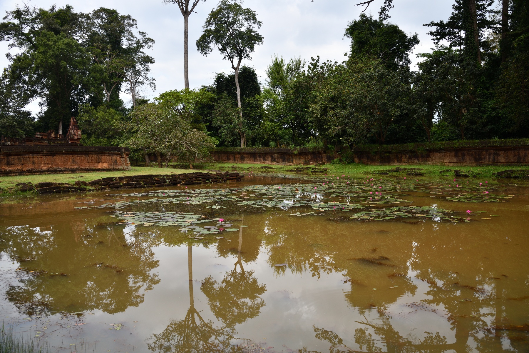 バンテアイ・スレイの帰りにシェムリアップ郊外を走行中。高校や農家の前を通った。農家では家の前の池が家畜と共用の飲料水だそうだ。