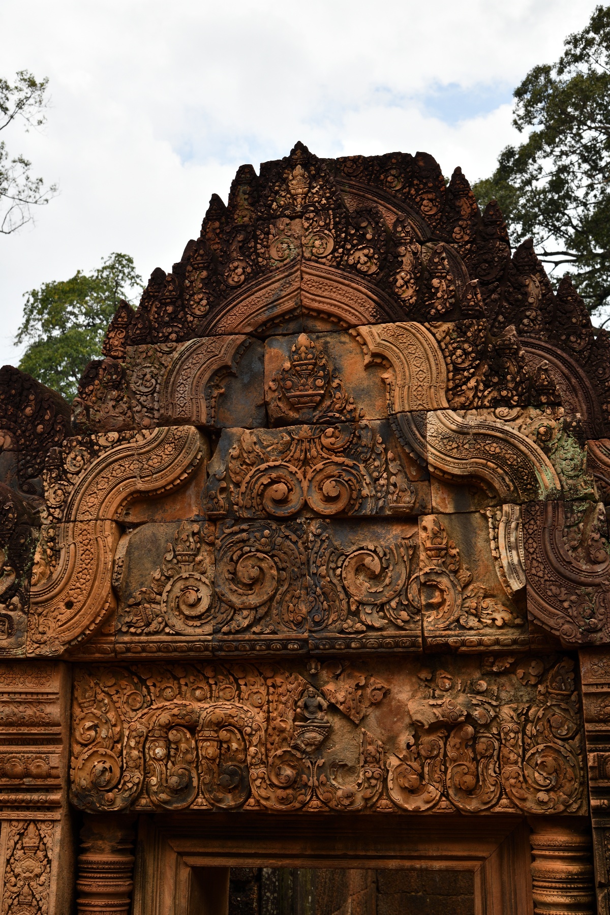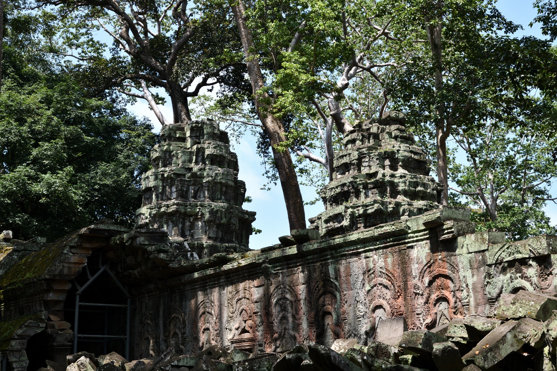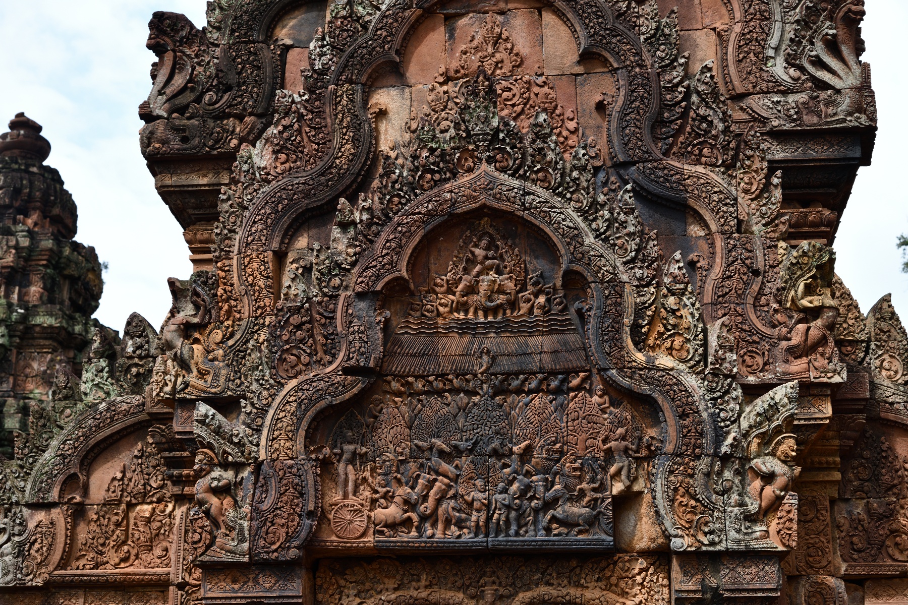 中央祠堂付近には塔が立ち並び、壁面にも像が刻まれている。