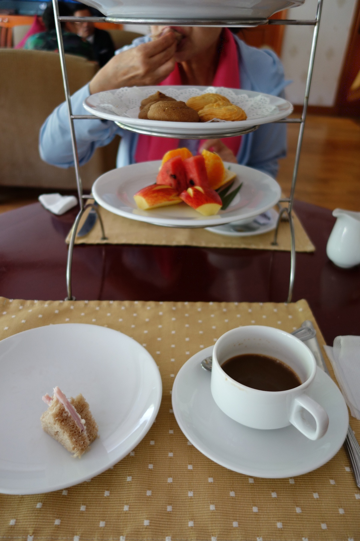 ホテルでアフタヌーンティーの無料券をもらっていたので、チェックアウトしてから出発時間までの間にお茶を飲んでいた。ケーキやフルーツなど沢山付いていた。