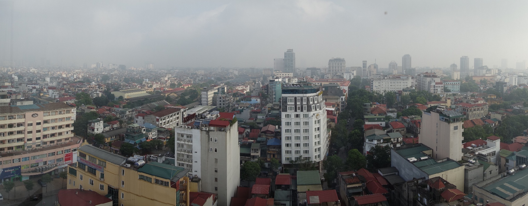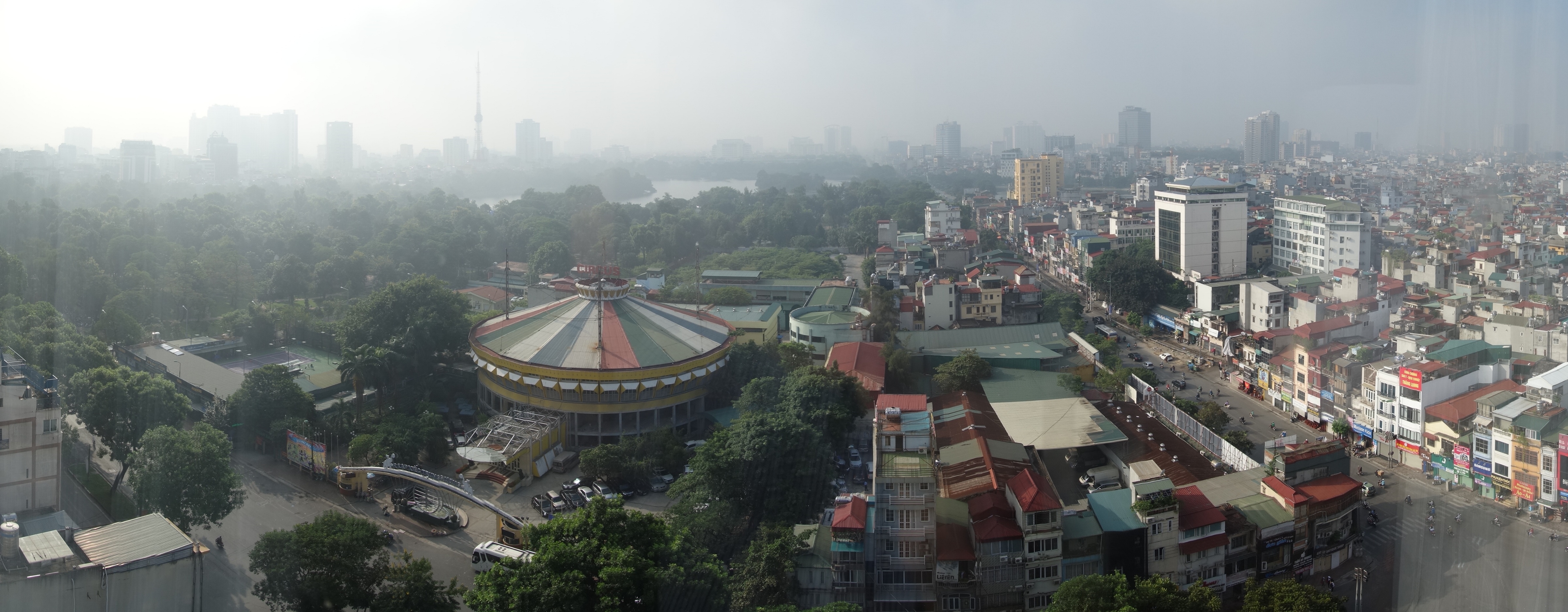 昨日とダブるがホテルニッコーハノイの窓からの景色を今度はスイングパノラマで撮影した。こちらは北側のハノイ駅方面。