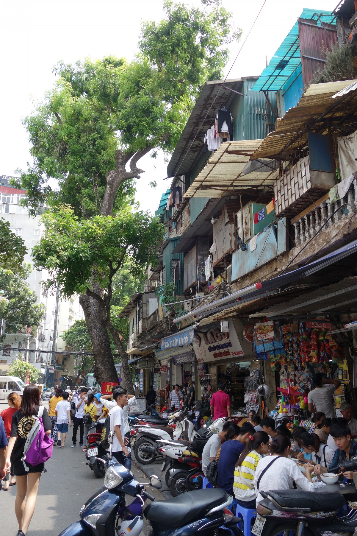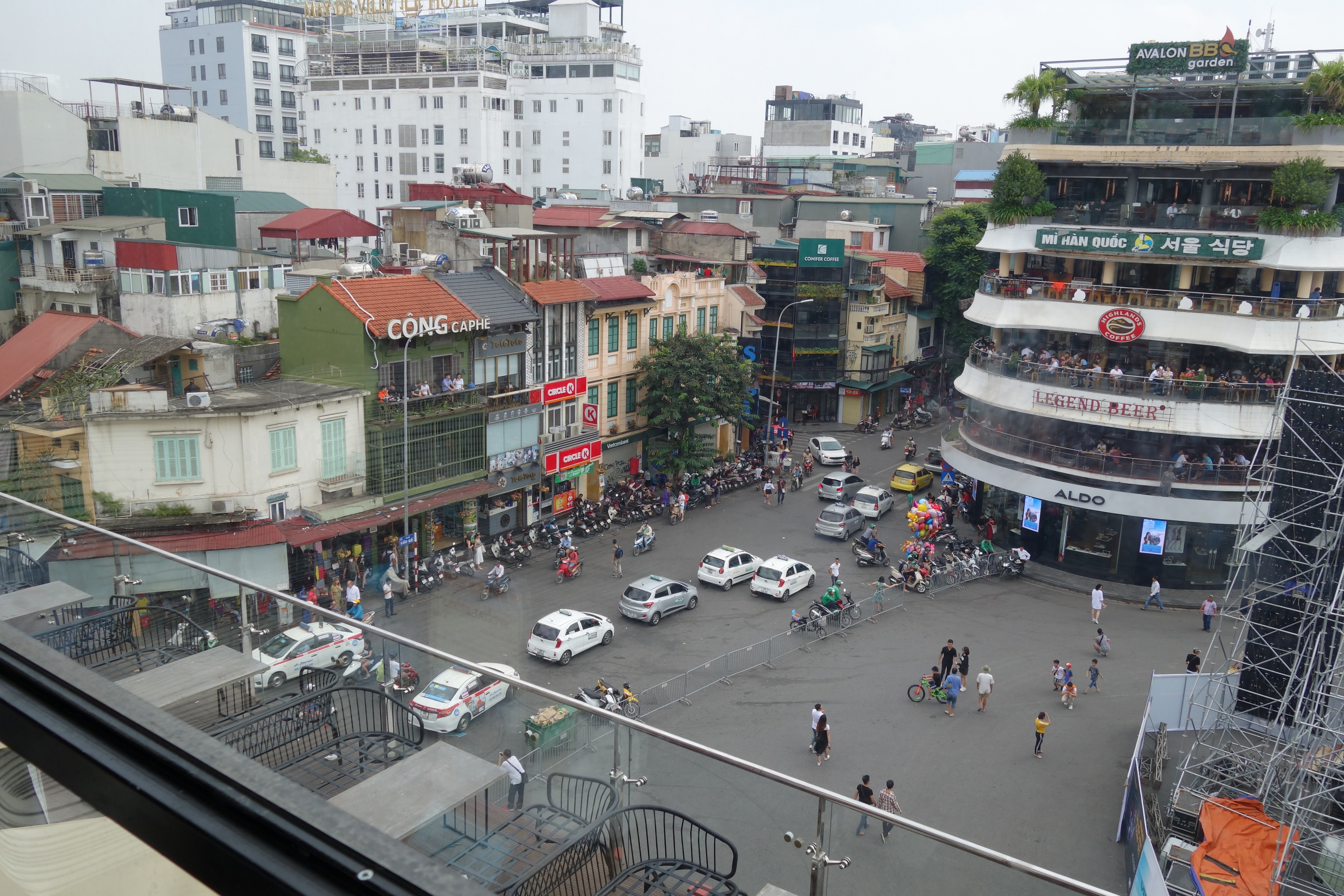 レストランを出て遭遇した、夜のハノイ旧市街のクルマとバイクと人のスクランブル交差点の様子。日本では考えらない。
