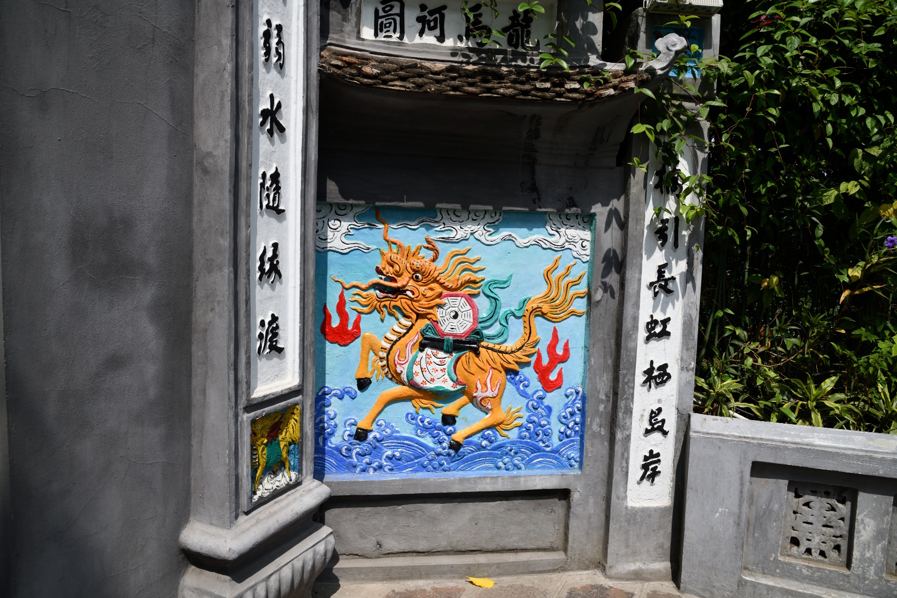 入口あたりにあった麒麟の彫り物。彩色されていて鮮やかだ。