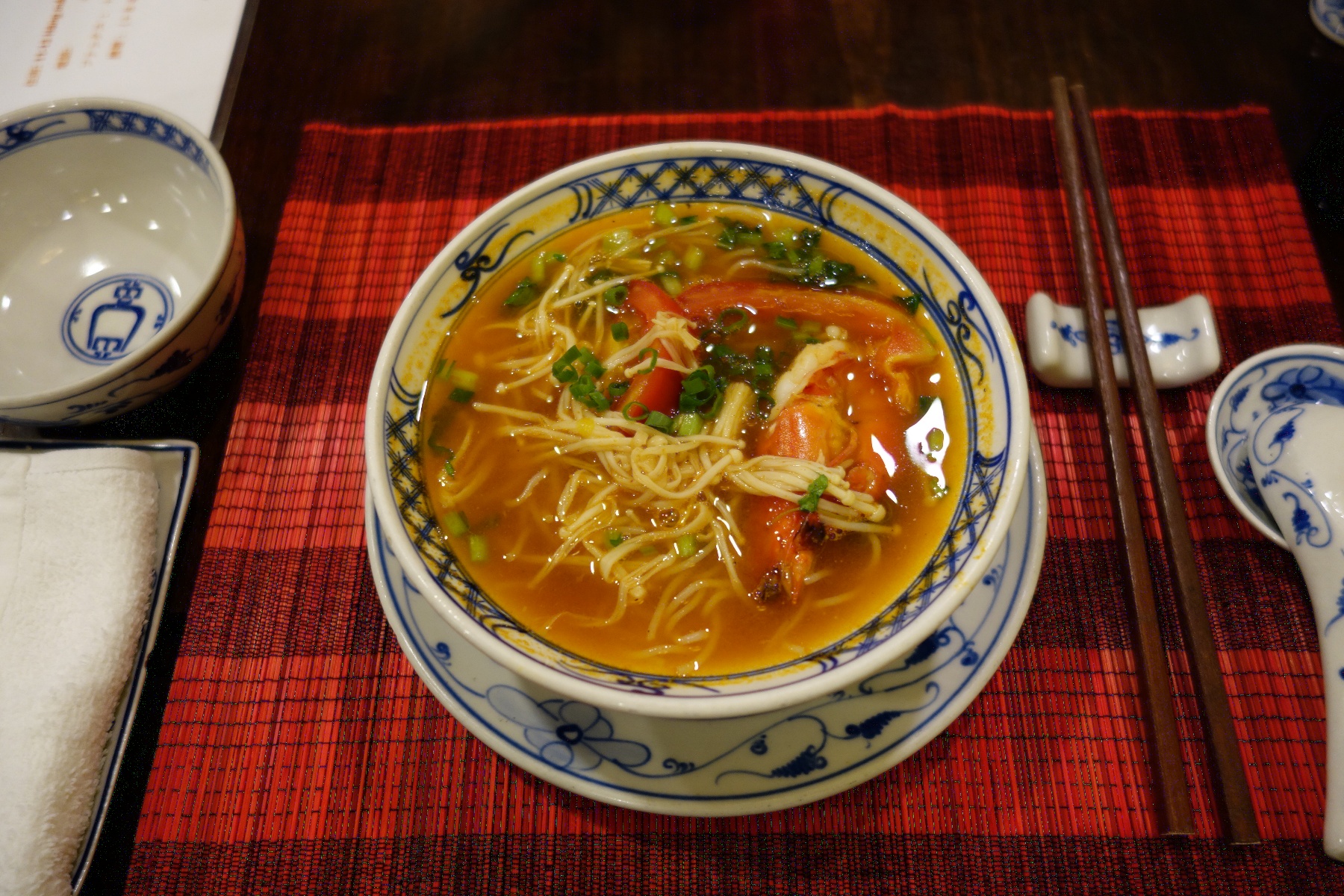 最初はプントム(細い麺、海老、えのこのスープ)。えのこって何だ?。