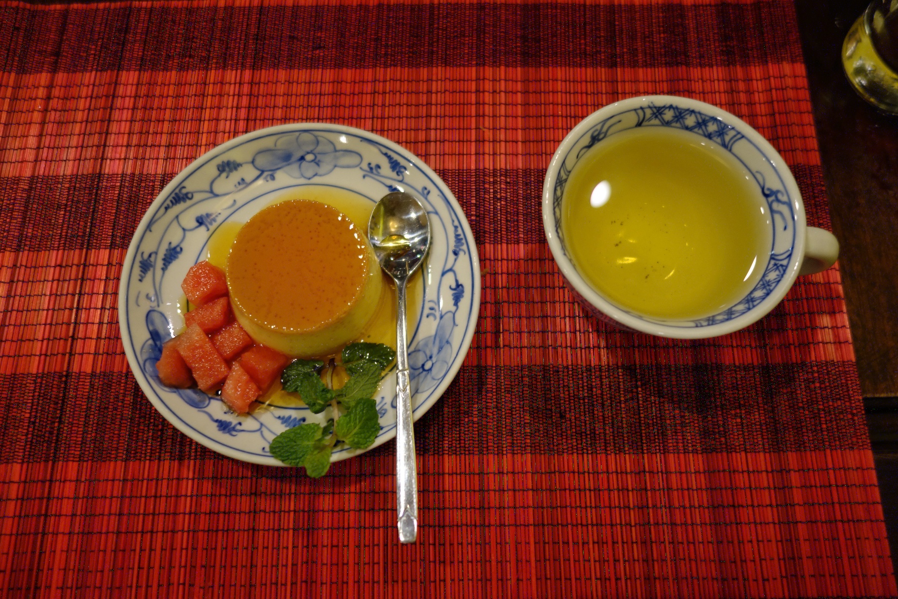 デザートのキャラメルプリンとお茶。メニューに書いてある通り、ごゆっくり楽しんだ。