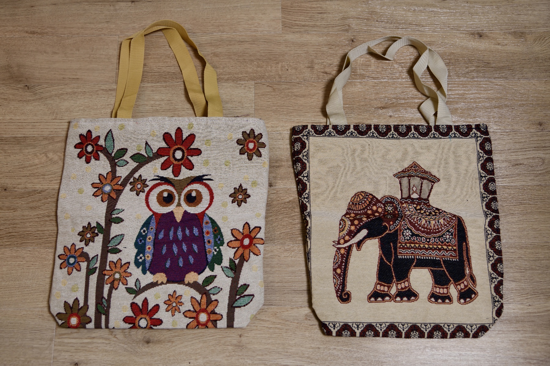 左はハノイの空港で、右はシェムリアップのスーパーで購入したバッグ。ピアノのレッスン時に楽譜を入れて使用している。