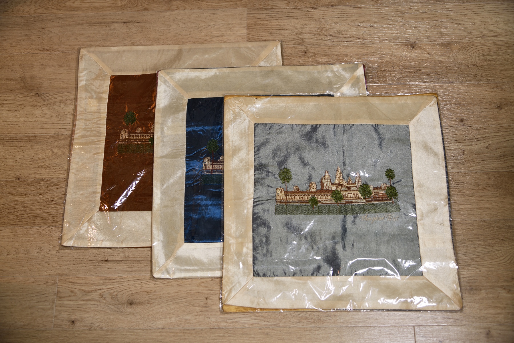 これもシェムリアップのオールドマーケットで購入したクッションカバー。色違いで6枚購入した。アンコールワットの絵柄が刺繍されている。