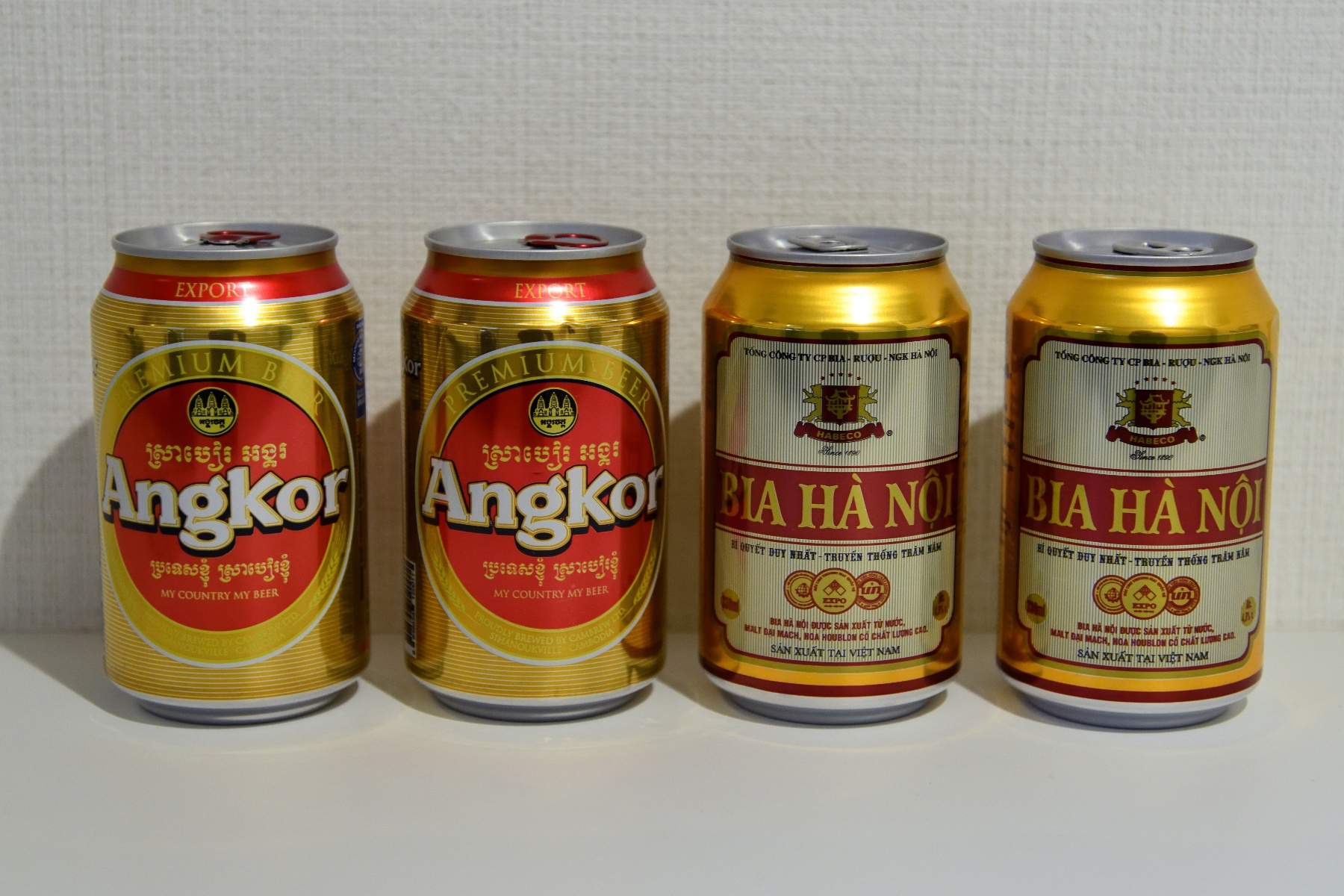 左がカンボジアのアンコールビール、右がベトナムのハノイビール。ハノイビールは1本50円程度。