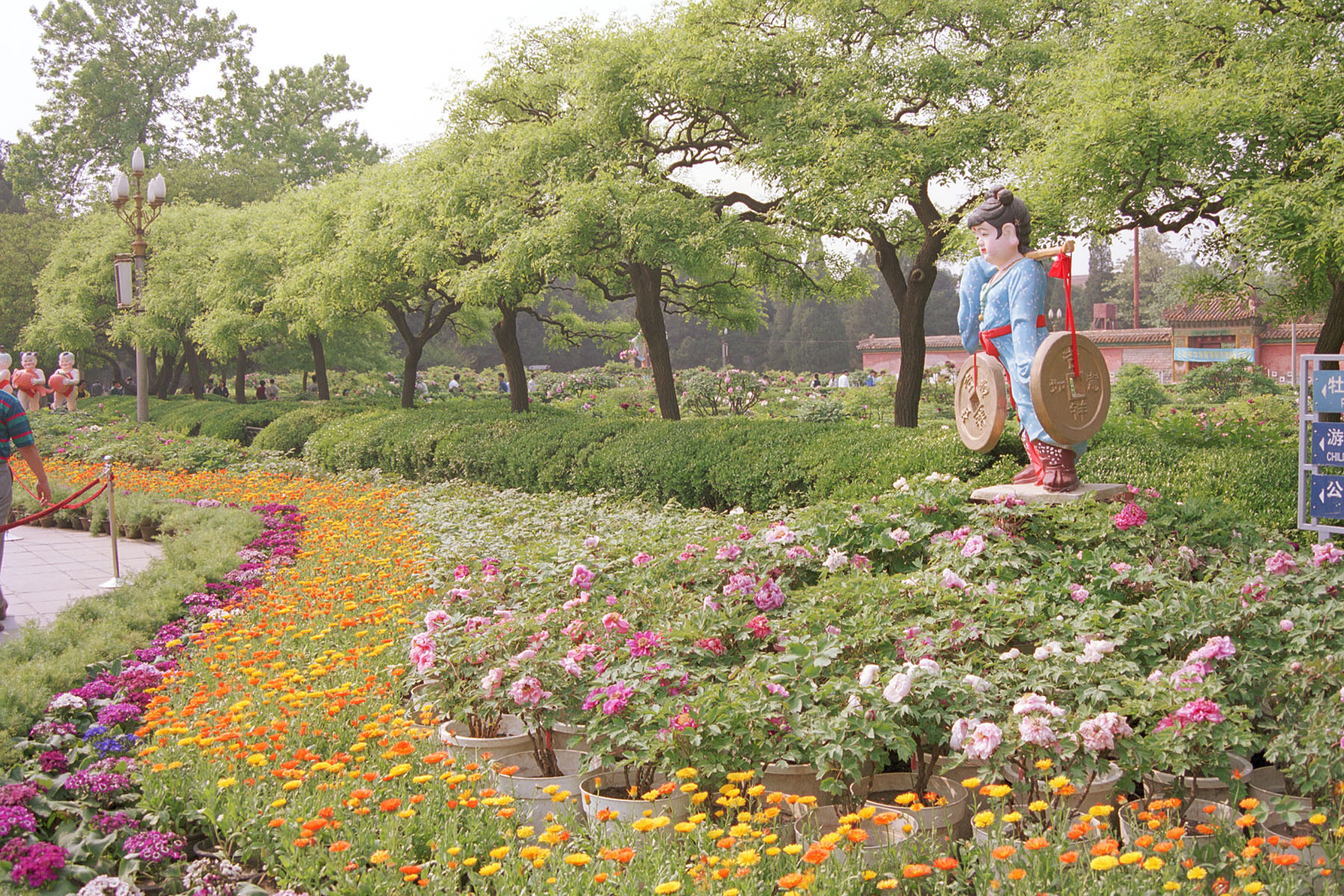 花壇の中の花は良く見ると全て鉢植えであることがわかる。北京の公園は良く手入れされているようだ。また中国の公園には、この写真のような一風変わった人形が置かれている事が多い。なぜ変わって見えるかと言うと、日本や欧米の銅像と違いきれいな彩色が施されているためと思われる。