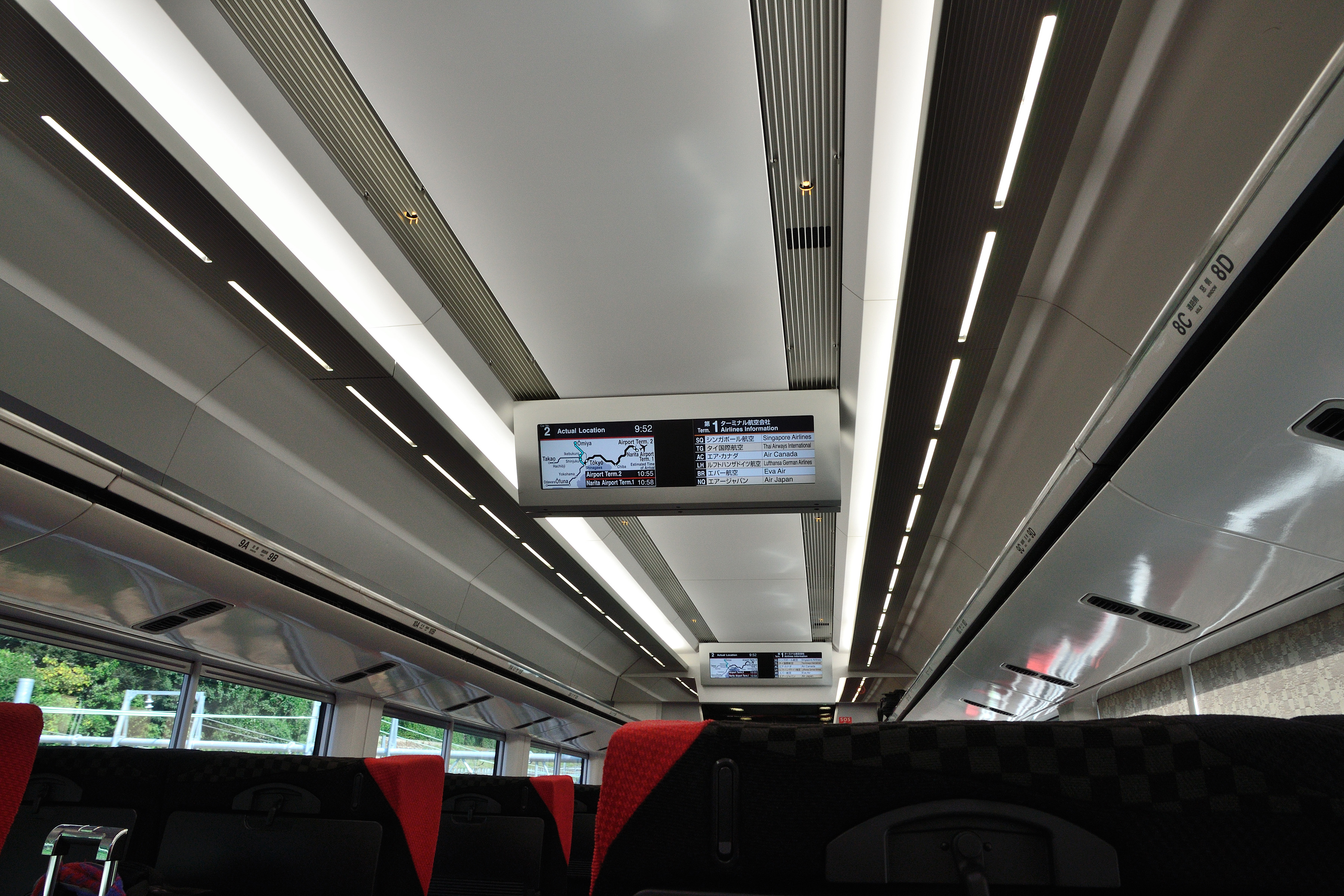 成田エクスプレスは渋谷9:45発、成田空港10:58着。車内はガラガラに空いていた。情報表示モニタには次々と色々な情報が表示されている。