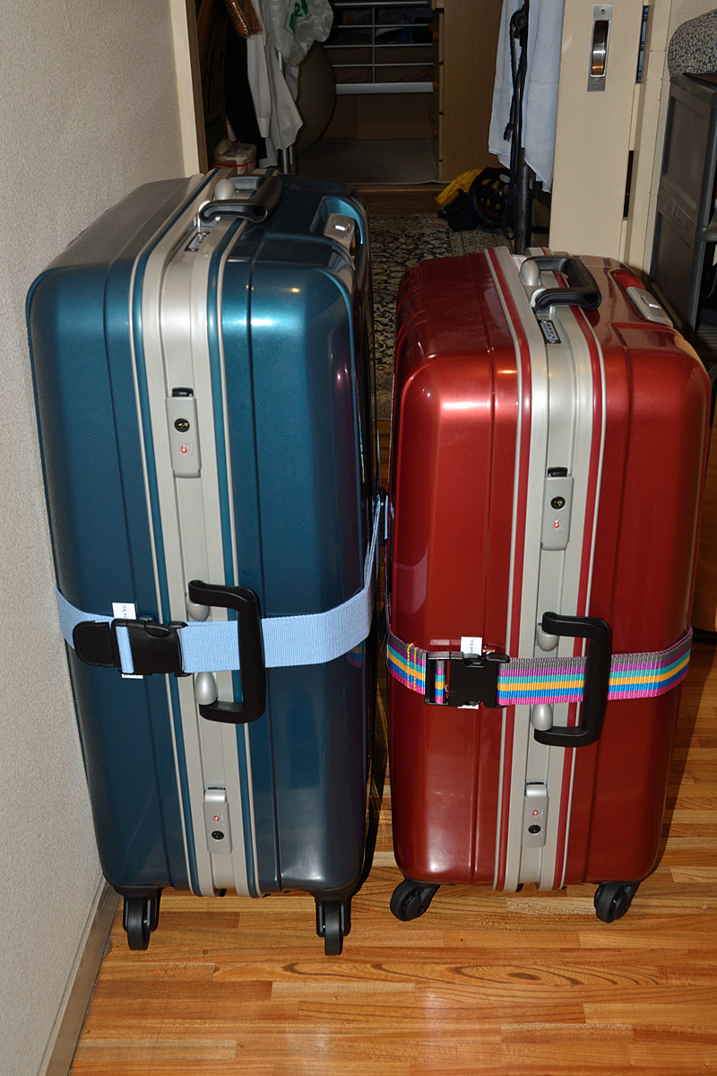 この時点では施錠してあるがアエロメヒコに預ける時は解錠状態にするようにとのこと。またスーツケース内外にローマ字で住所氏名を表示するようにとのことだったので、外は2カ所にスッテカー用紙で作成した住所氏名ラベルを貼り付けておいた。ベルトの下に見える白いのがそれ。