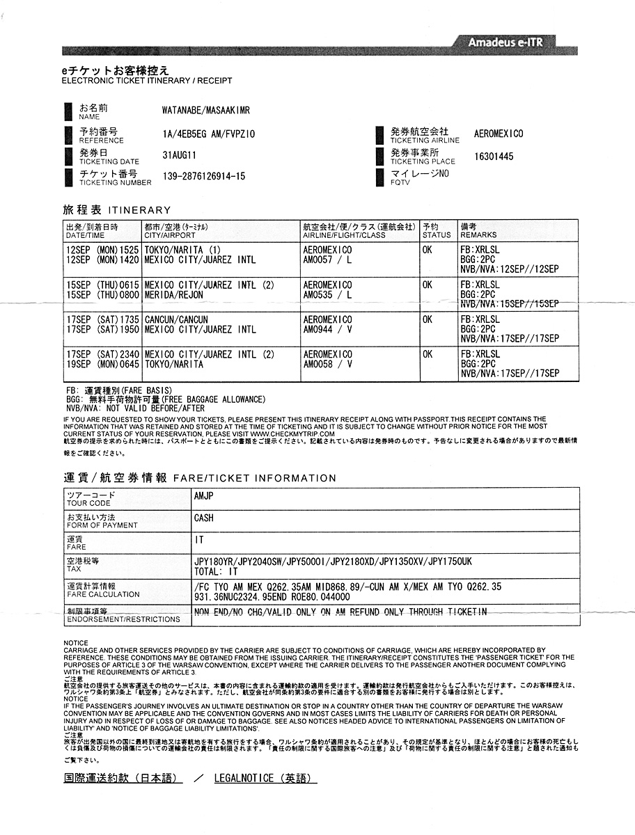 これがeチケット控え。この時は提示したが、メキシコ国内でのチェックインの際はパスポートを提示するだけで航空券をもらえたので、使う場面は無かった。