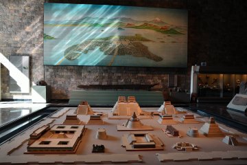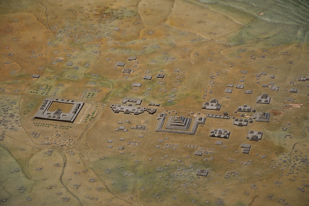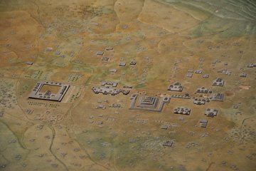 テオティワカンの配置模型で、月のピラミッド、太陽のピラミッド、ケツァルコアトル神殿の配置などがよくわかる。
