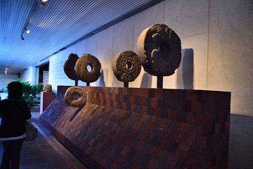 上のドクロの円盤の左右に形の異なる頭像が置かれている。これらもドクロだろうか?。