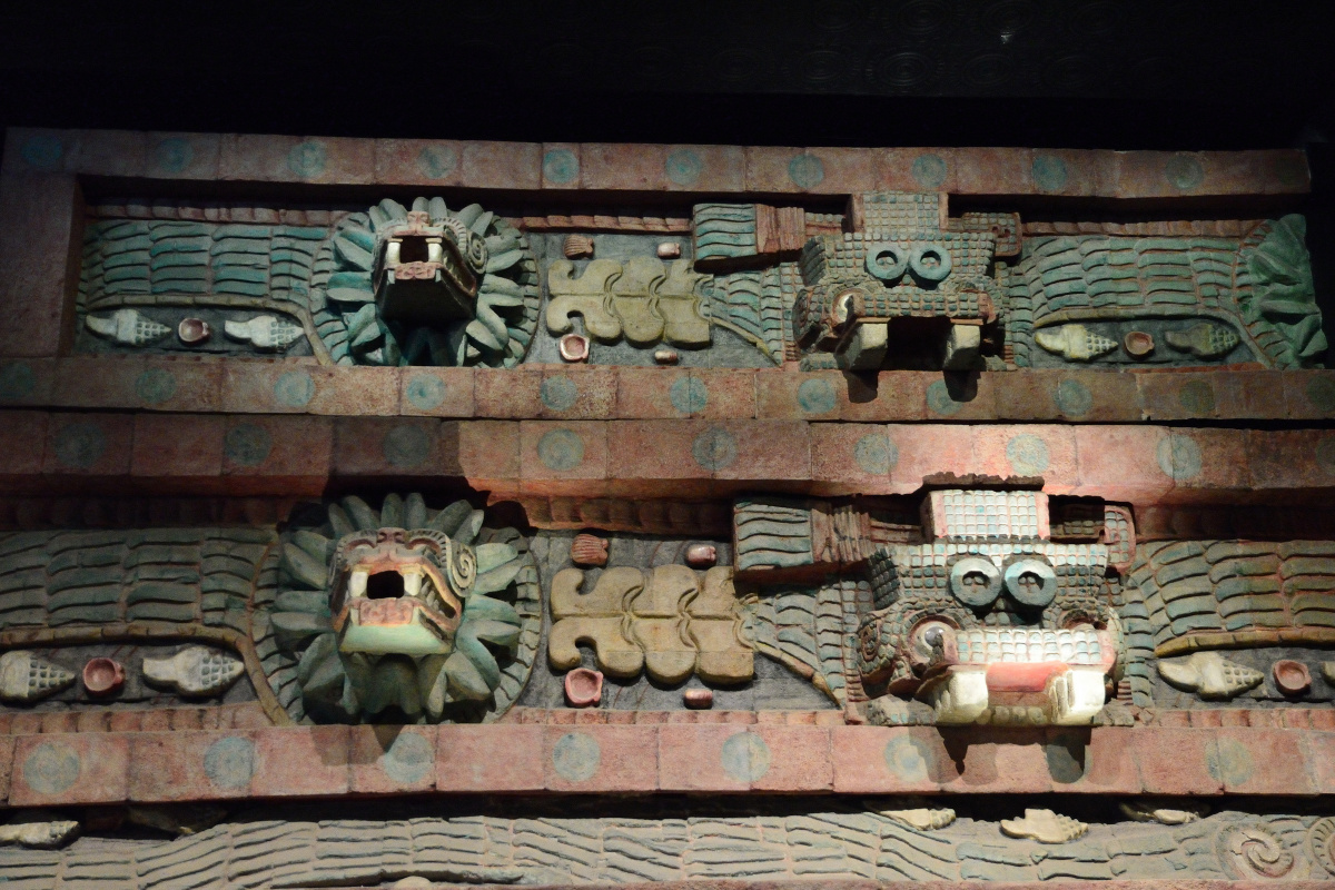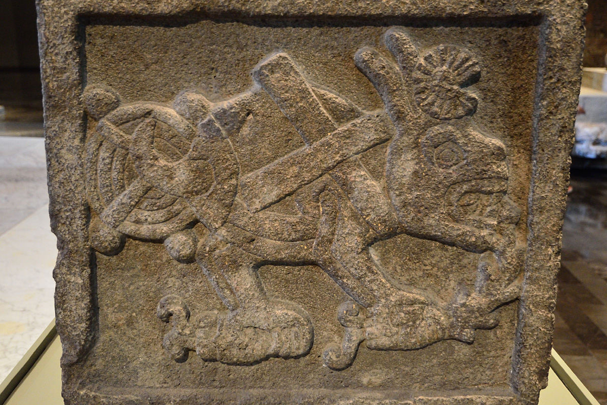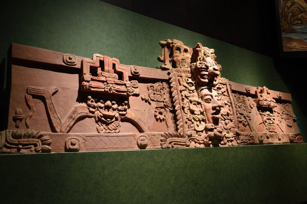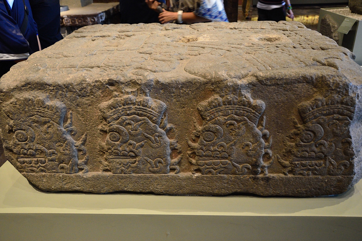 これはピラミッド頂上の神殿に通じる階段の両側の壁装飾だったもの。中央に火の神、両脇に暦の象徴を支える2人の神が配されている。